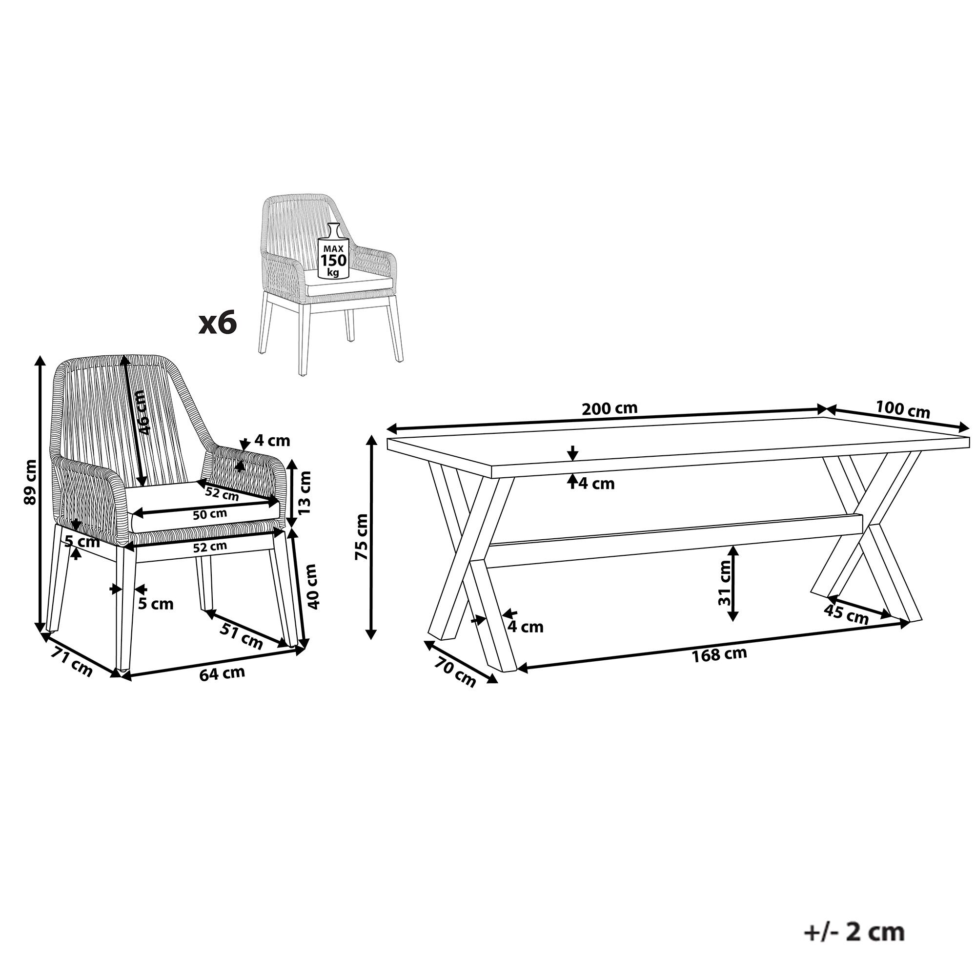Kaunis ulkoruokaryhmä. Tämä ulkoruokailuryhmä tuo tyyliä mihin tahansa ulkotilaan. Tilavalla pöytälevyllä varustettu puutarhapöytä ja mukana tulevat tuolit tarjoavat tilaa jopa kuudelle hengelle. Kaikki osat on valmistettu sääolosuhteita ja kosteutta kestävistä materiaaleista, jotka ovat helppohoitoisia. Pöytälevy on valmistettu kuitusementistä. Tuolien selkänojat on valmistettu rottinkia muistuttavasta muovipunoksesta. Kalusteita korostavat akaasiasta valmistetut jalat. Mukana tulevat pehmusteet tarjoavat lisämukavuuden. Muotoilunsa ansiosta tämä kalustesetti sopii moniin ulkotiloihin, moderneista perinteisiin.