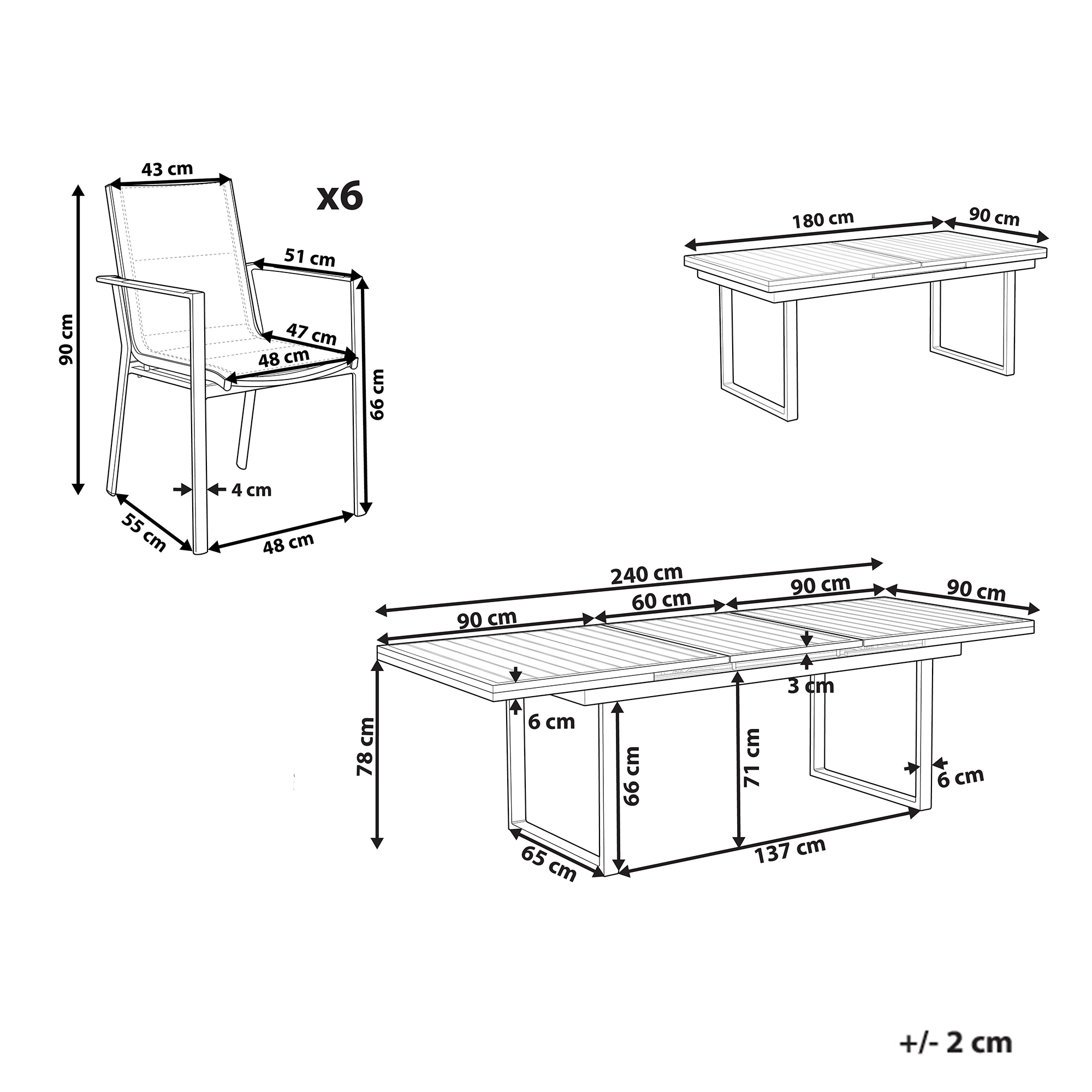 Ominaisuudet: Täydellinen ruokailuun suuremmissa ryhmissä, Modernia tyyliä terassille ja puutarhaan, Vankka ja kestävä rakenne, UV-kestävyys 5 (ISO 105-B02), Jatkettava pöytätaso tarjoaa lisää tilaa, Pinottavan ominaisuuden ansiosta helppo säilyttää