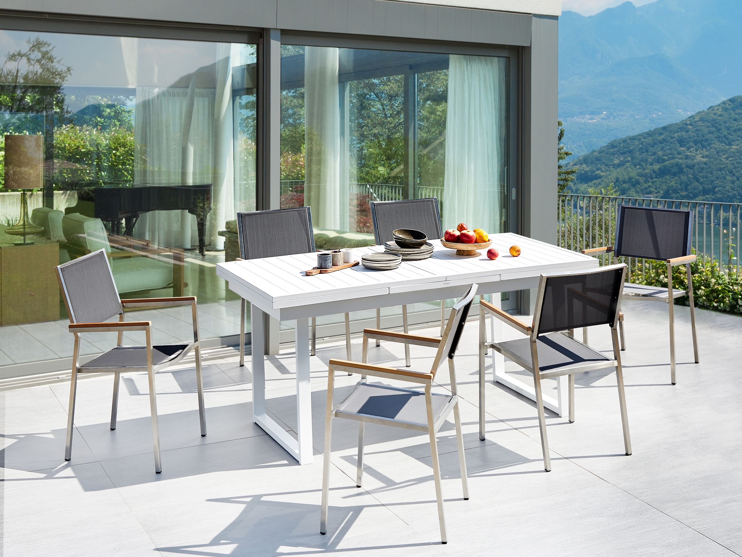 Tilava ruokailusetti kuudelle hengelle. Tämä moderni ulkoruokailuryhmä sisältää jatkettavan pöydän ja kuusi tuolia, sopien ihanteellisesti isoihin illanistujaisiin sekä kokoontumisiin. Kevyestä mutta kestävästä alumiinista valmistettu pöytä tarjoaa runsaasti tilaa ruokailutarvikkeille, ja vankat ruostumattomasta teräksestä valmistetut tuolit takaavat istumamukavuuden. Neutraali väripaletti tarjoaa monipuolisia tyylimahdollisuuksia ja säänkestävät materiaalit takaavat pitkäikäisyyden.