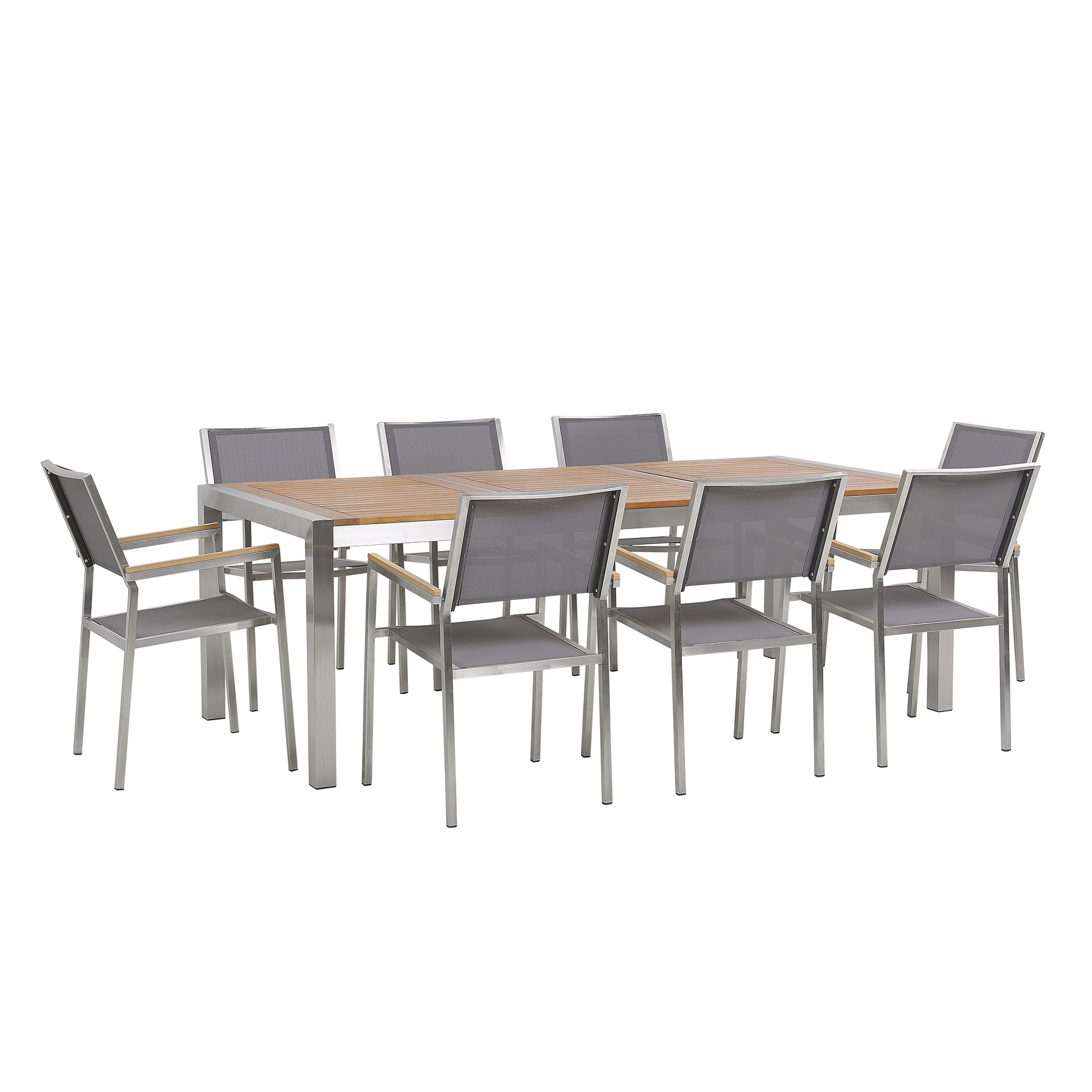Elegantti pöytäryhmä puisella pöydällä ja harmailla tuoleilla. Poikkeuksellinen puutarhakalustesetti, joka luo ainutlaatuisen ilmeen mihin tahansa puutarhaan. Kalusteiden rungot on valmistettu vankasta ja kestävästä ruostumattomasta teräksestä, joka takaa, että setti pysyy upeana pitkään. Hopea runko korostaa luonnollista eukalyptuspuutasoa kauniisti. Pinottavien tuolien selkänojat ja istuinosat ovat UV-kestävää harmaata polyesteriä, joka täydentää pöytää täydellisesti. Säänkestävien materiaalien yhdistelmä antaa ulkoruokailuryhmälle modernin ilmeen. Setti tarjoaa tilaa jopa kahdeksalle hengelle, jonka ansiosta se on täydellinen lisä kesän puutarhajuhliin.