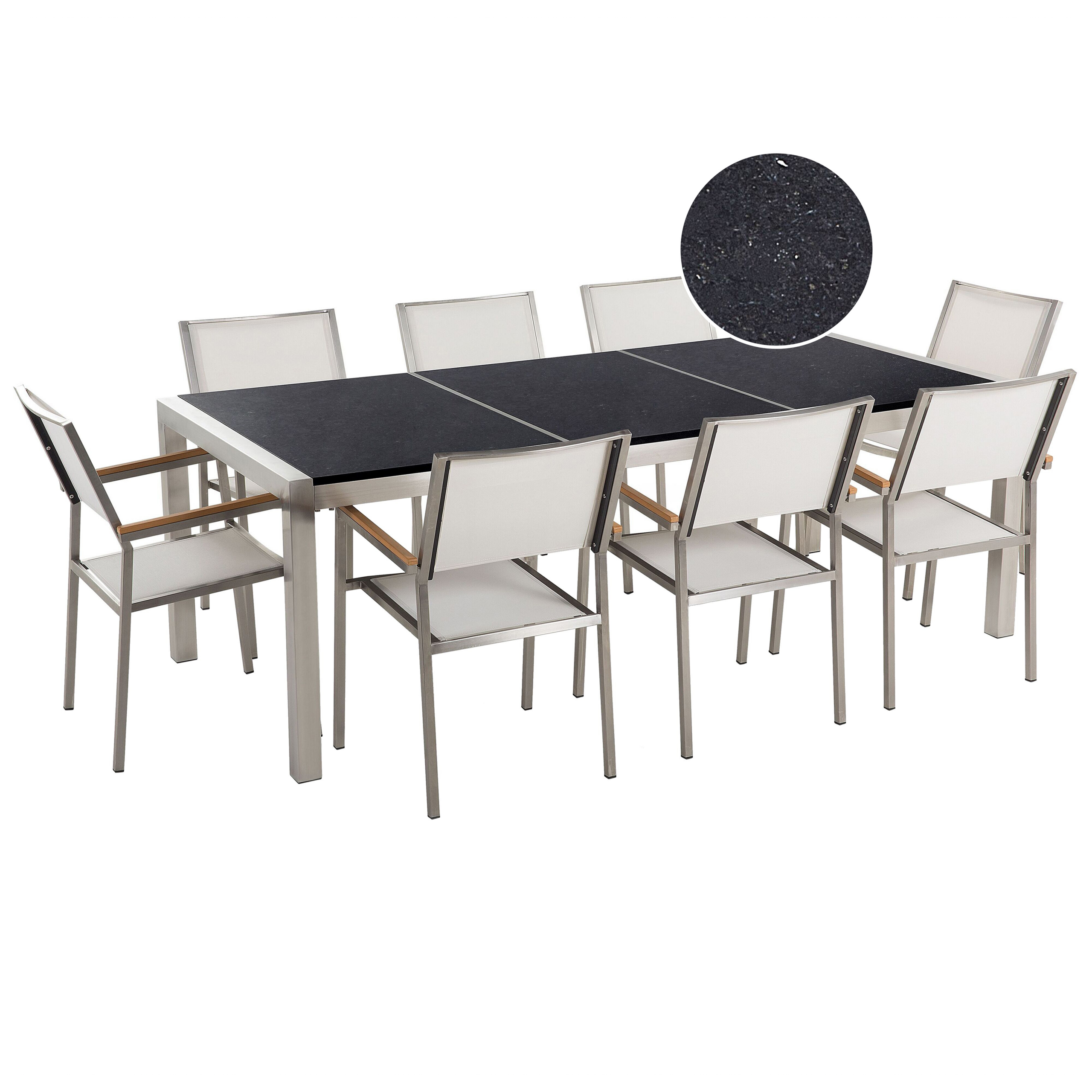 Elegantti pöytäryhmä mustalla pöydällä ja valkoisilla tuoleilla. Poikkeuksellinen puutarhakalustesetti, joka luo ainutlaatuisen ilmeen mihin tahansa puutarhaan. Kalusteiden rungot on valmistettu vankasta ja kestävästä ruostumattomasta teräksestä, joka takaa, että setti pysyy upeana pitkään. Hopea runko korostaa mustaa kiillotettua graniittitasoa kauniisti. Pinottavien tuolien selkänojat ja istuinosat ovat UV-kestävää valkoista polyesteriä, joka täydentää pöytää täydellisesti. Säänkestävien materiaalien yhdistelmä antaa ulkoruokailuryhmälle modernin ilmeen. Setti tarjoaa tilaa jopa kahdeksalle hengelle, jonka ansiosta se on täydellinen lisä kesän puutarhajuhliin.