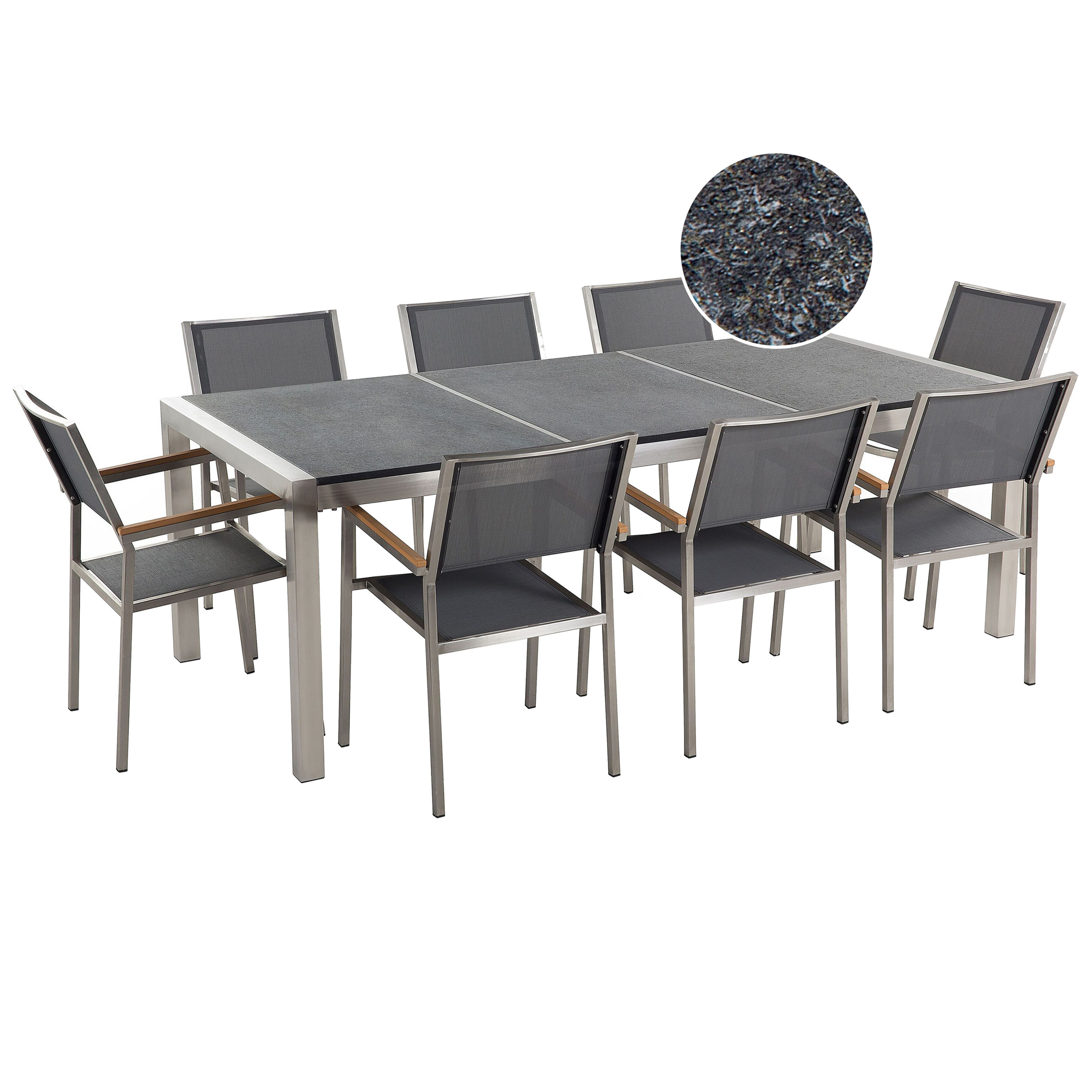 Elegantti pöytäryhmä mustalla pöydällä ja harmailla tuoleilla. Poikkeuksellinen puutarhakalustesetti, joka luo ainutlaatuisen ilmeen mihin tahansa puutarhaan. Kalusteiden rungot on valmistettu vankasta ja kestävästä ruostumattomasta teräksestä, joka takaa, että setti pysyy upeana pitkään. Hopea runko korostaa mustaa poltettua graniittitasoa kauniisti. Pinottavien tuolien selkänojat ja istuinosat ovat UV-kestävää harmaata polyesteriä, joka täydentää pöytää täydellisesti. Säänkestävien materiaalien yhdistelmä antaa ulkoruokailuryhmälle modernin ilmeen. Setti tarjoaa tilaa jopa kahdeksalle hengelle, jonka ansiosta se on täydellinen lisä kesän puutarhajuhliin.