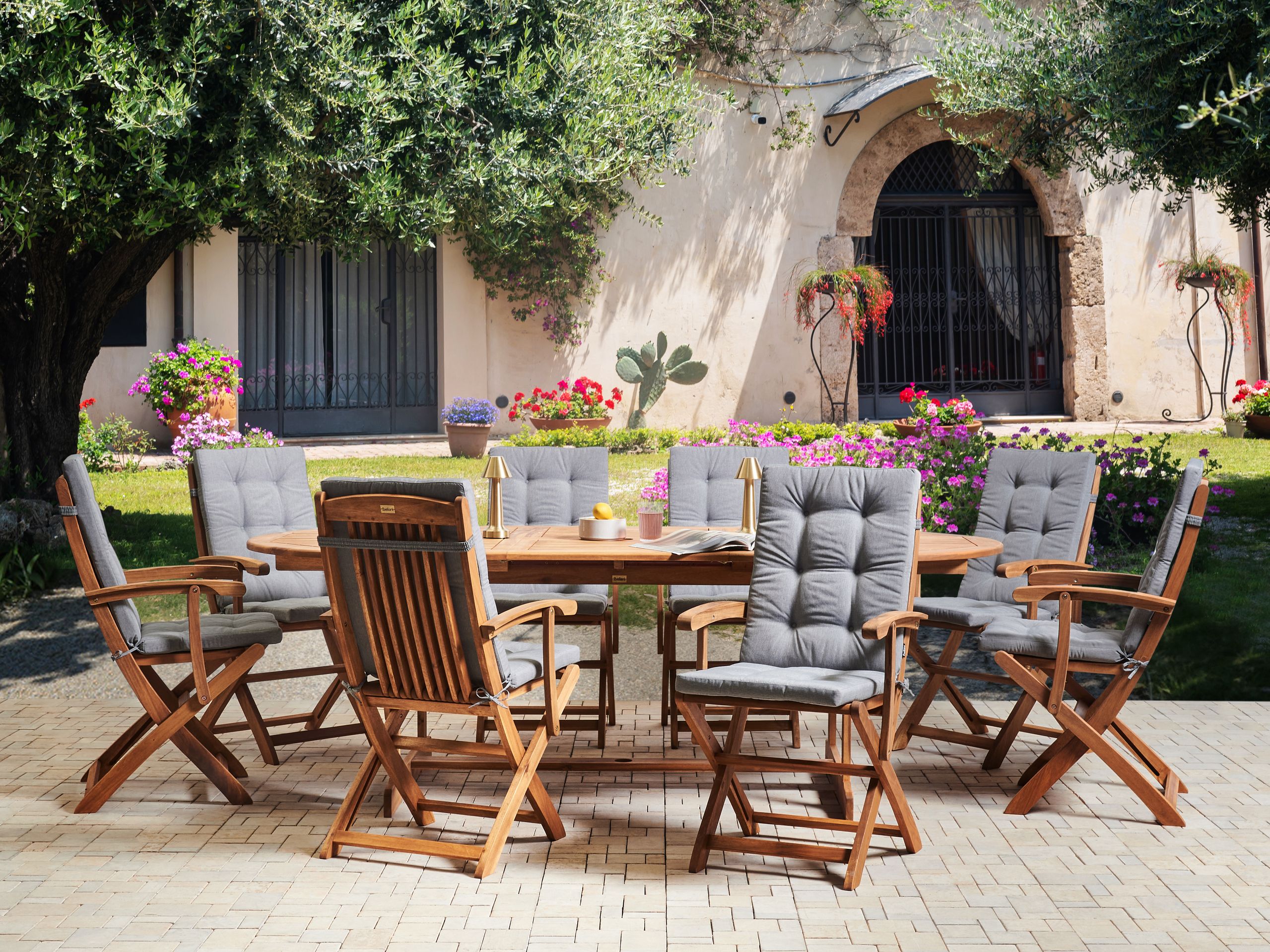 Rustiikkinen puutarhan ruokailuryhmä kahdeksalle hengelle. Tämä käytännöllinen, yhdeksänosainen ulkoruokailuryhmä on valmistettu akaasiapuusta, ja se piristää ulkotilaa kauniilla, lämpimällä sävyllään. Perhosmekanismilla jatkettava pöytä sisältää reiän aurinkovarjolle. Kokoontaitettavat, korkeaselkäiset puutarhatuolit säästävät tilaa, kun ne eivät ole käytössä, ja tarjoavat miellyttävän istumiskokemuksen. Jokaisessa tuolissa on muhkea, runsaalla vaahtomuovilla täytetty pehmuste, joka takaa erinomaisen mukavuuden. Ne pysyvät paikoillaan kätevien siteiden ansiosta, ja haalistumista kestävät päälliset säilyttävät raikkaan ilmeen koko kauden. Klassisen mutta yksinkertaisen muotoilunsa ansiosta ruokailuryhmä sulautuu sekä moderneihin että perinteisiin sisustuksiin.