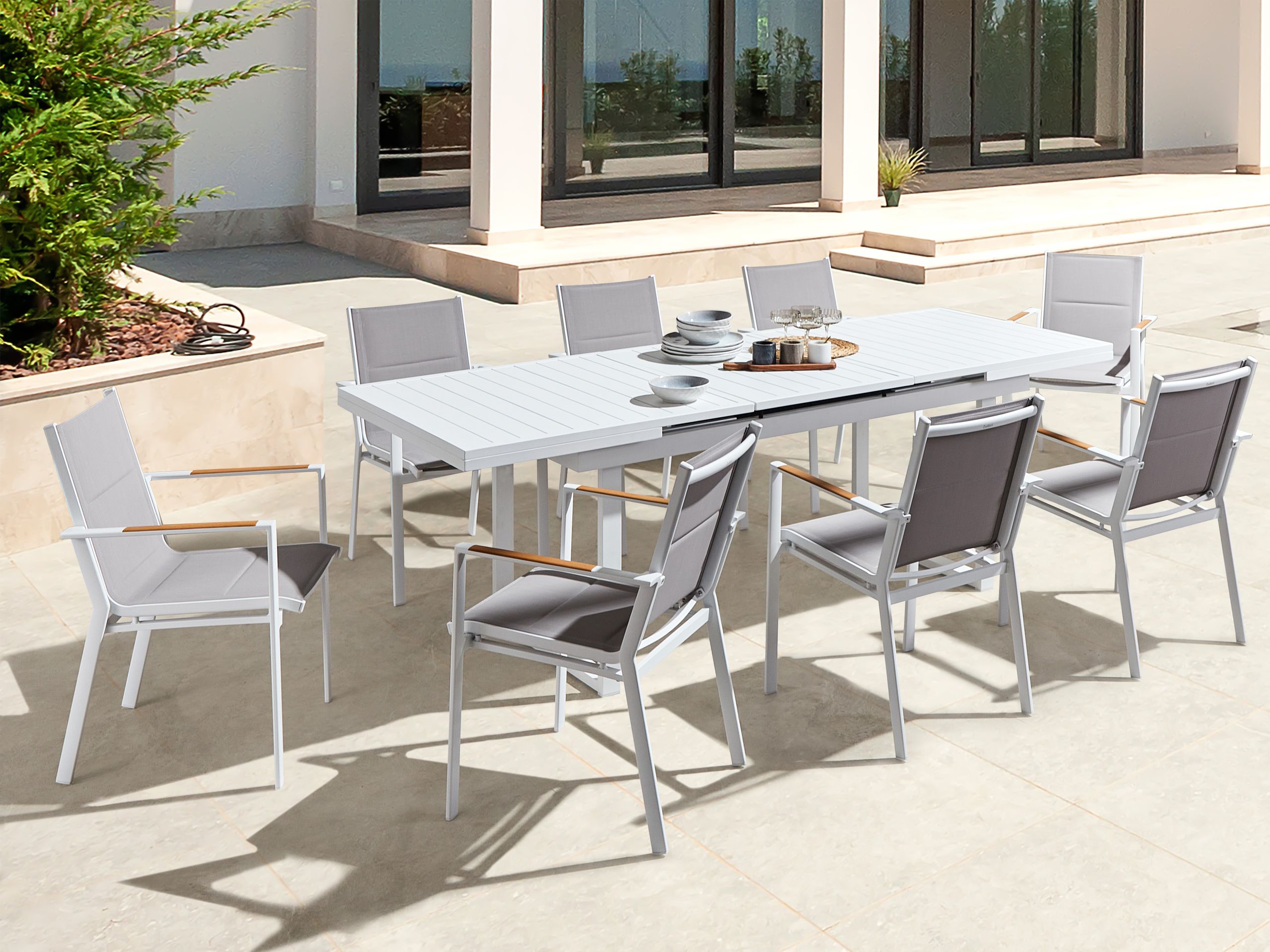 Moderni puutarhakalustesetti. Nauti auringosta ja hyvästä ruuasta yhdessä ystävien ja perheen kesken tällä tilavalla ulkoruokailuryhmällä. Jatkettavasta pöydästä ja kahdeksasta tuolista koostuva setti on valmistettu korkealaatuisesta ja kestävästä valkoiseksi jauhemaalatusta alumiinista. Irrotettavan jatkopalan ansiosta pöydän jatkaminen käy helposti ja vaivattomasti. Istuinosien paksu polyesteriverhoilu ja muovisella puujäljitelmällä päällystetyt käsinojat takaavat istumamukavuuden ja oikeanlaisen tuen. Neutraalit värit antavat kalustesetille modernin mutta minimalistisen ilmeen, joka sopii useisiin erilaisiin ulkosisustuksiin.