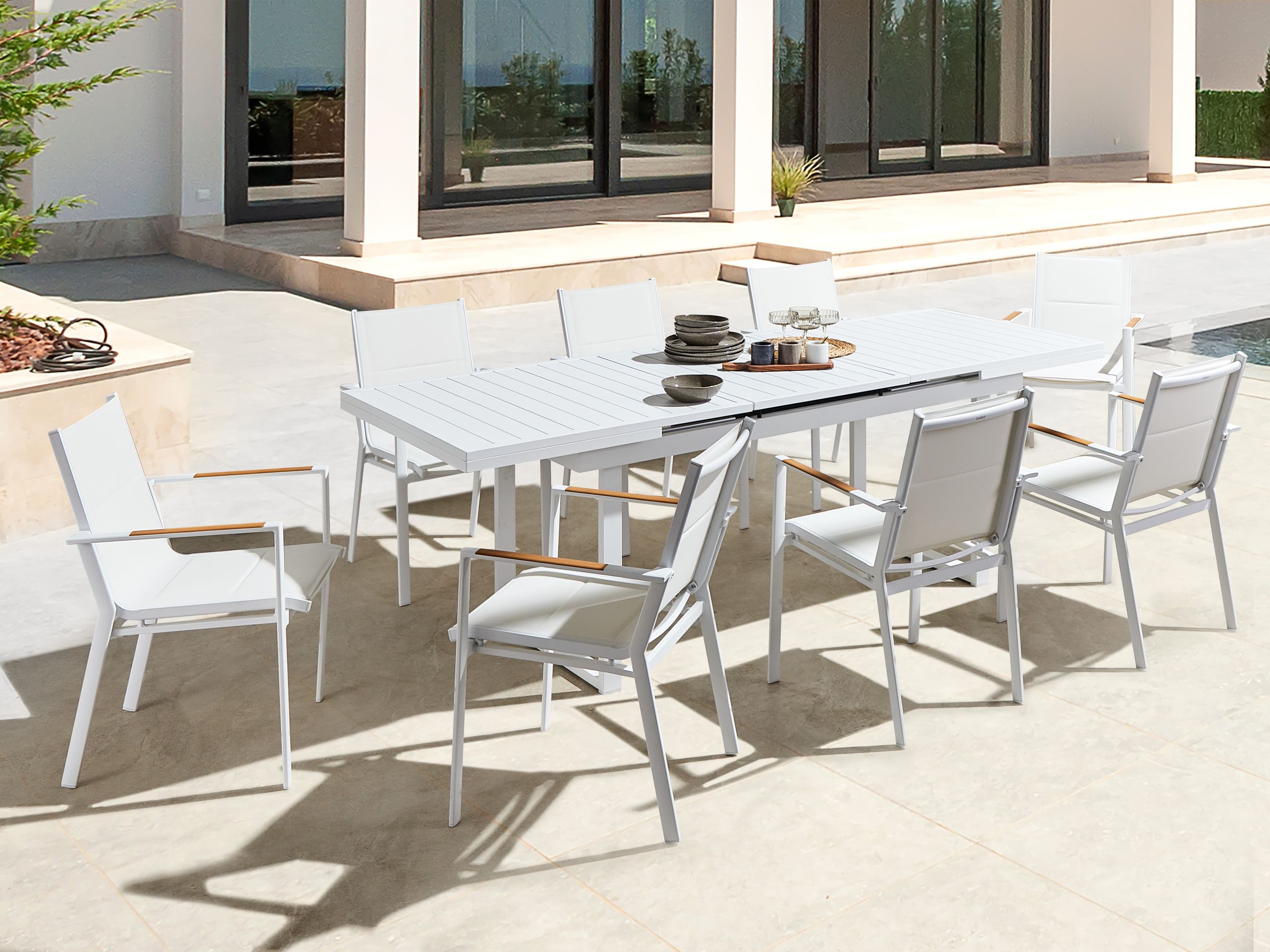 Moderni puutarhakalustesetti. Nauti auringosta ja hyvästä ruuasta yhdessä ystävien ja perheen kesken tällä tilavalla ulkoruokailuryhmällä. Jatkettavasta pöydästä ja kahdeksasta tuolista koostuva setti on valmistettu korkealaatuisesta ja kestävästä valkoiseksi jauhemaalatusta alumiinista. Irrotettavan jatkopalan ansiosta pöydän jatkaminen käy helposti ja vaivattomasti. Istuinosien paksu polyesteriverhoilu ja muovisella puujäljitelmällä päällystetyt käsinojat takaavat istumamukavuuden ja oikeanlaisen tuen. Neutraalit värit antavat kalustesetille modernin mutta minimalistisen ilmeen, joka sopii useisiin erilaisiin ulkosisustuksiin.