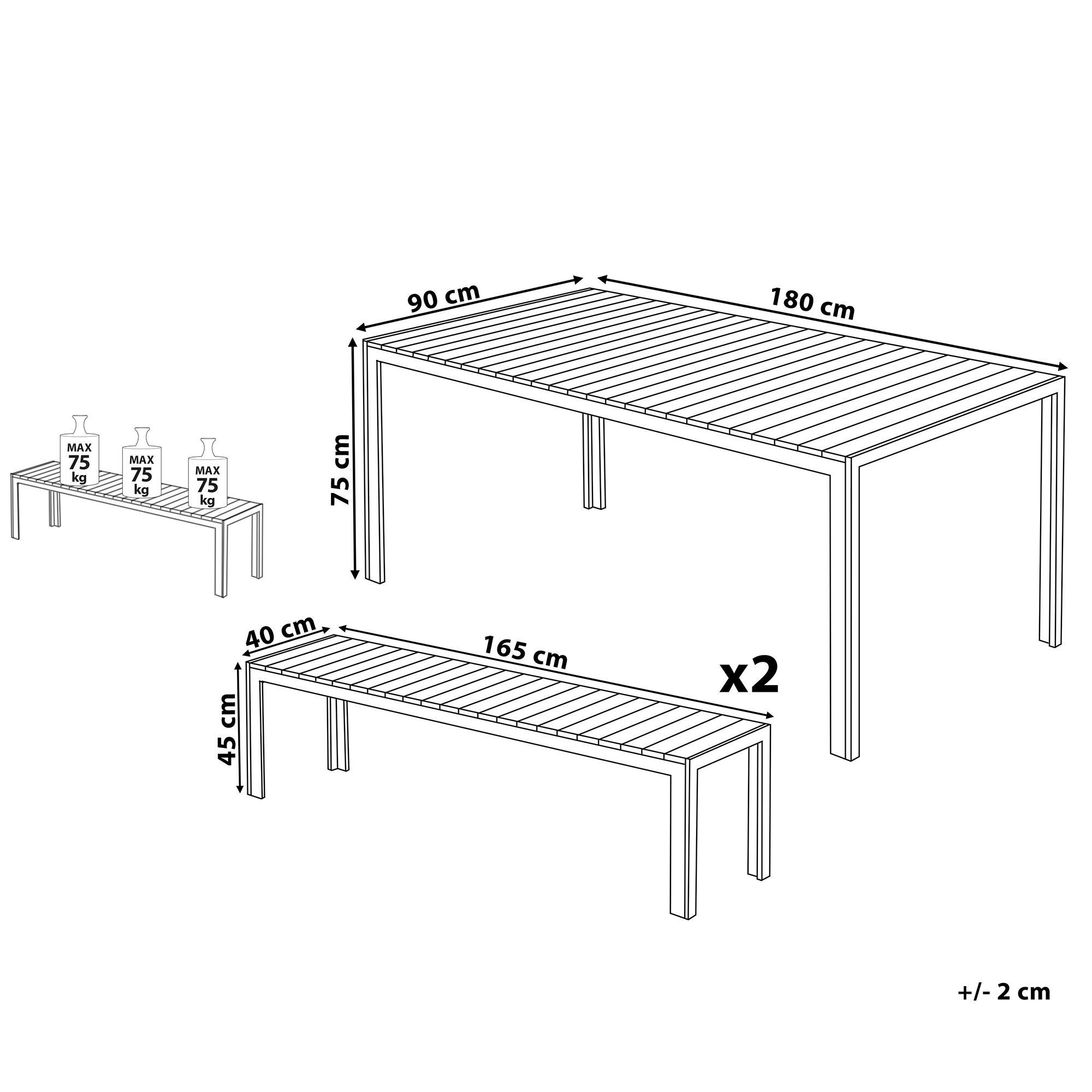 Industriaalinen puutarhan ruokailuryhmä penkeillä. Tämä industriaalinen ulkoruokailuryhmä luo tyylikkään ja ylellisen ilmeen jokaiseen puutarhaan tai terassille. Setti koostuu kahdesta penkistä sekä suorakulmaisesta puutarhapöydästä. Niiden rungot on valmistettu kestävästä alumiinista, kun taas pöytälevy ja istuinosat ovat helppohoitoista muovista puujäljitelmää. Materiaaliensa ansiosta ruokailuryhmä kestää loistavasti erilaisia sääolosuhteita. Penkkien leveät istuimet tarjoavat mukavasti tilaa jopa kuudelle hengelle. Puutarhakalustesetin minimalistinen muotoilu sulautuu erinomaisesti moderneihin ulkotiloihin.