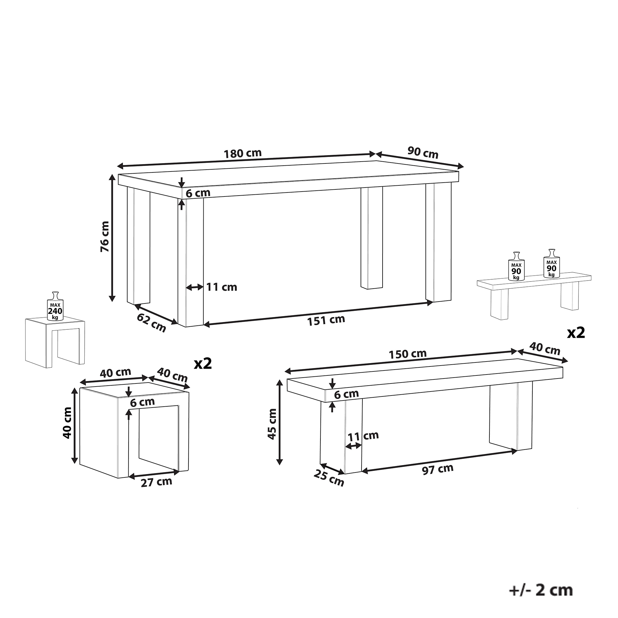 Hintaan sisältyy: 1 x Pöytä, 2 x Penkki, 2 x Jakkara