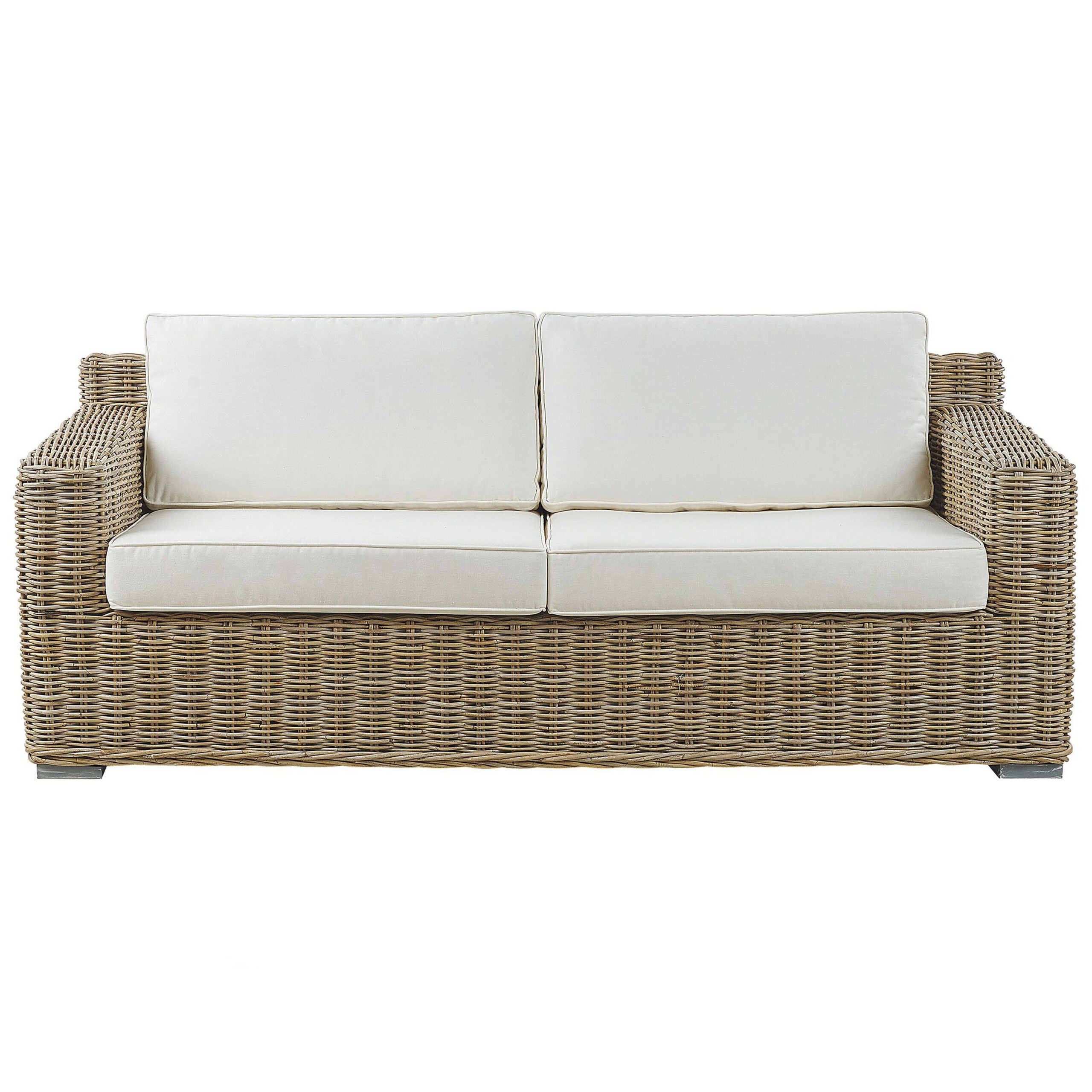 Boheemi puutarhan sohvaryhmä tyynyillä. Tämä 4-istuttava sohvaryhmä huokuu 70-luvun boho-tyyliä. Setti sisältää 2-istuttavan sohvan sekä 2 nojatuolia, jotka luovat kutsuvan oleskelualueen mihin tahansa tilaan. Luonnollisesta, vaaleasävyisestä rottinkipunoksesta valmistetut kalusteet tuovat vintage-ilmettä ja nostalgista tunnelmaa. Paksut luonnonvalkoiset pehmusteet takaavat mukavan istumakokemuksen. Pehmusteiden päälliset on helppo irrottaa puhdistusta varten kätevän vetoketjun ansiosta.