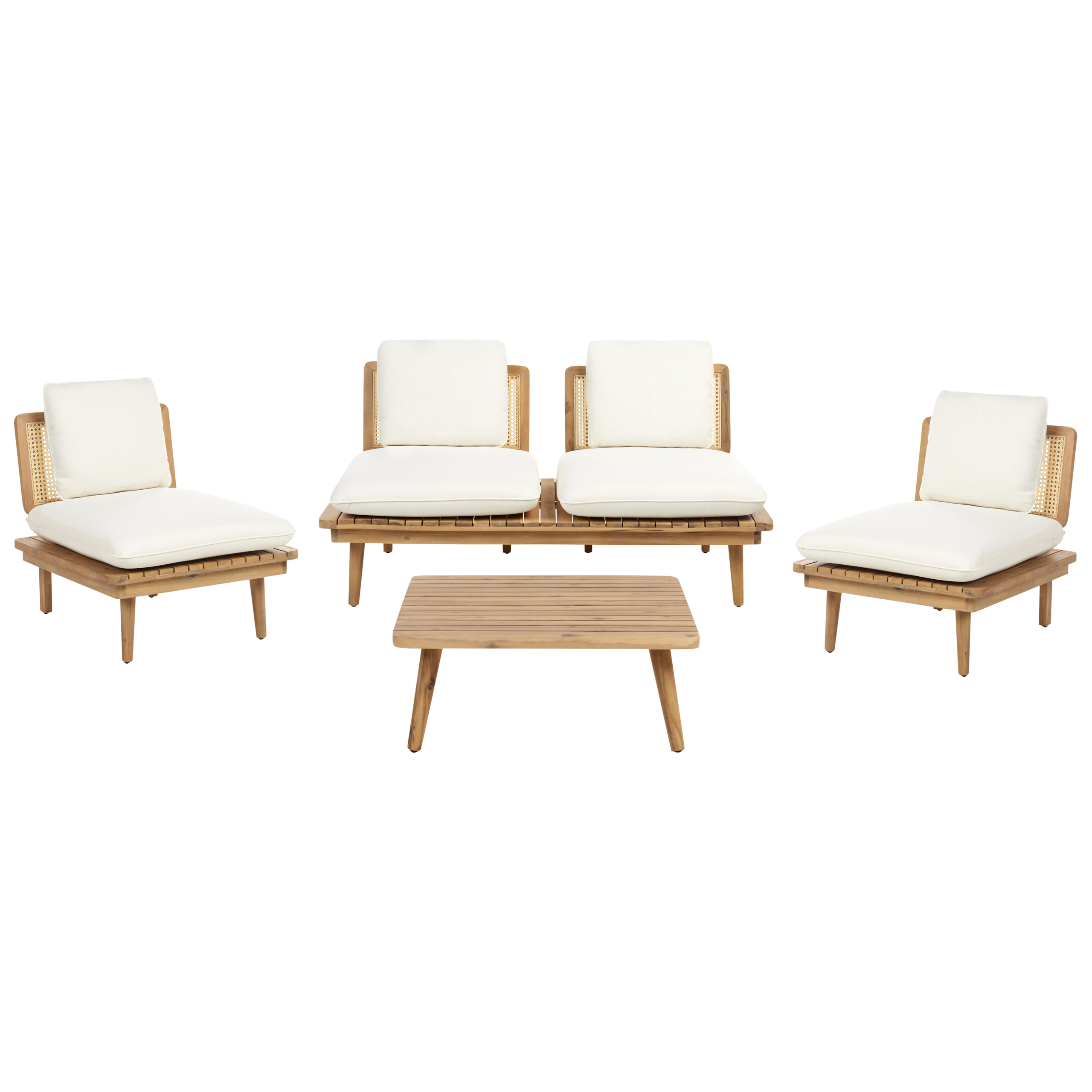 Boheemi puutarhan sohvaryhmä rottinkipunoksella. Muunna ulkotilasi viihtyisäksi ja elegantiksi oleskelupaikaksi tällä tyylikkäällä ulkosohvaryhmällä, johon kuuluu kaksi nojatuolia, 2-istuttava sohva sekä nelikulmainen sohvapöytä. Korkealaatuisesta sertifioidusta akasiapuusta valmistettuja kalusteita täydentävät polyrottinkipunoksella koristellut selkänojat sekä luonnolliset puunsyyt ja -solmut, mikä tekee setistä täydellisen valinnan boho-tyylisiin, rustiikkisiin tai välimerellisiin ympäristöihin. Mukana tulevissa tyynyissä on ylläpitoa helpottavat irrotettavat päälliset, joiden säänkestävä rakenne tekee niistä ihanteelliset katettuihin tiloihin.