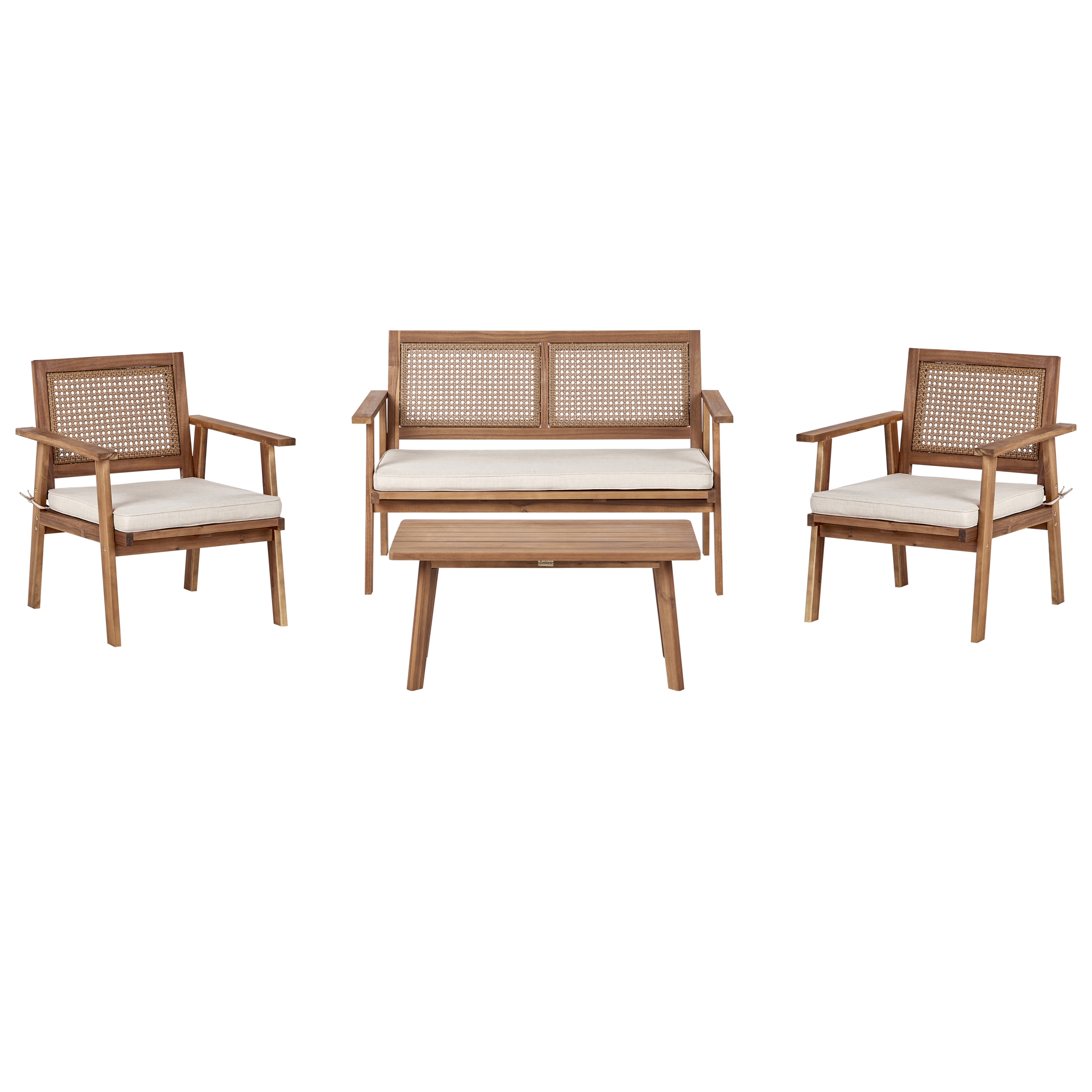 Perinteinen puutarhan sohvaryhmä. Koe ylellisyys ja mukavuus tällä akaasiapuisella ulkosohvaryhmällä. Tyylikäs kokonaisuus sisältää kaksi nojatuolia, 2-istuttavan sohvan ja sohvapöydän, mikä tarjoaa täydellisen paikan rentoutumiseen ulkona. Selkänojissa on kauniit rottinkipunokset, jotka lisäävät hienostuneisuutta ja tekevät setistä erottuvan. Pehmeät istuintyynyt on varustettu irrotettavilla, vetoketjullisilla päällisillä helpon ylläpidon takaamiseksi. Sohvasetti yhdistää kestävyyden ja ajattoman tyylin, luoden puutarhaan kutsuvan oleskelupaikan.