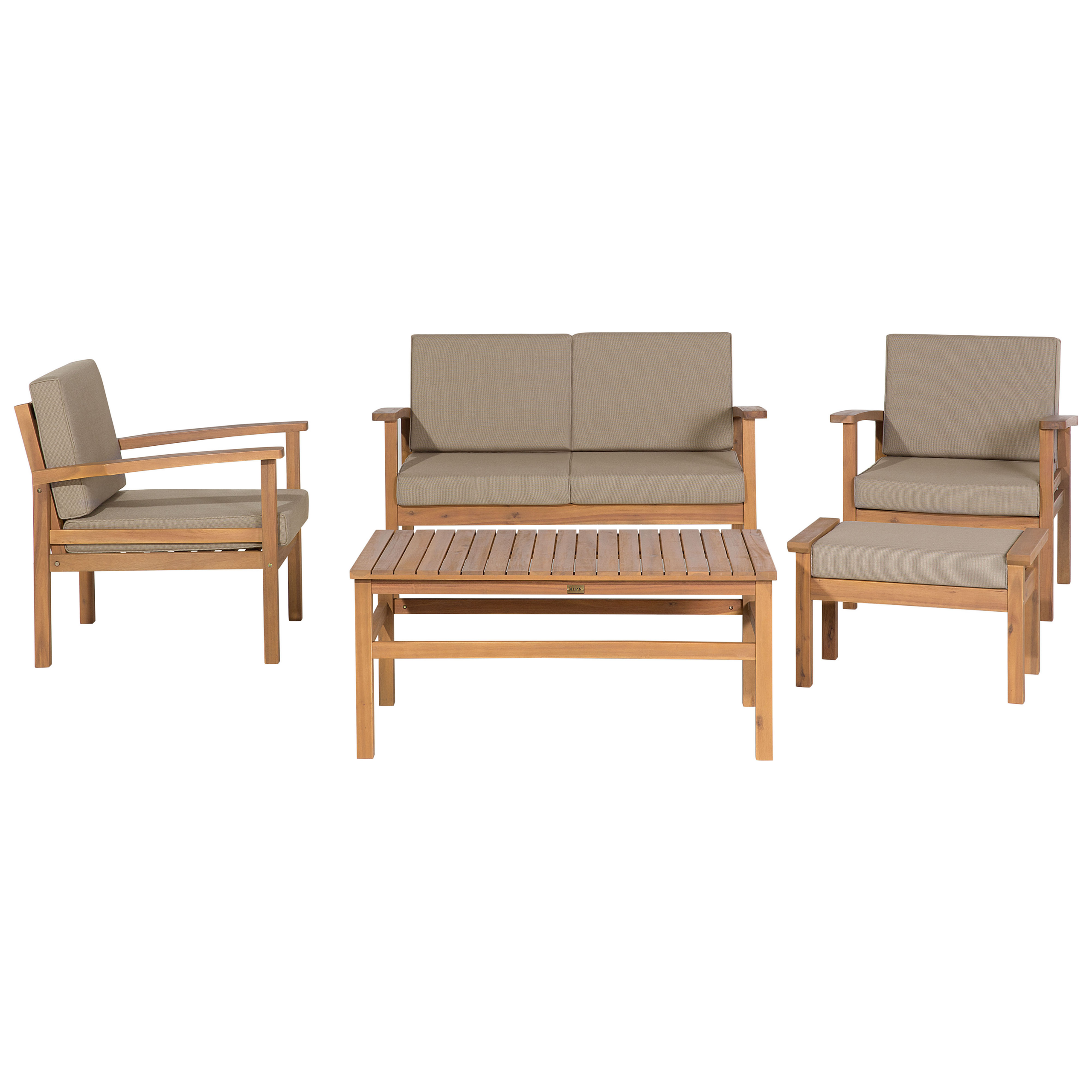 Rustiikkinen sohvaryhmä puutarhaan. Viimeistele ulkotilasi tällä tyylikkäällä ulkosohvaryhmällä. Se koostuu sohvapöydästä, 2-istuttavasta penkistä, rahista ja kahdesta nojatuolista. Kalusteet on valmistettu vankasta sertifioidusta akaasiasta, joka takaa erinomaisen kestävyyden vaihtelevia sääolosuhteita vastaan. Mukana tulevat yhteensopivat, ruskeanharmaan väriset pehmusteet ovat paksusti pehmustettuja mukavan istumakokemuksen takaamiseksi. Ajaton, maalaismainen muotoilu tekee sohvaryhmästä täydellisen sekä perinteisiin että moderneihin ulkotiloihin.