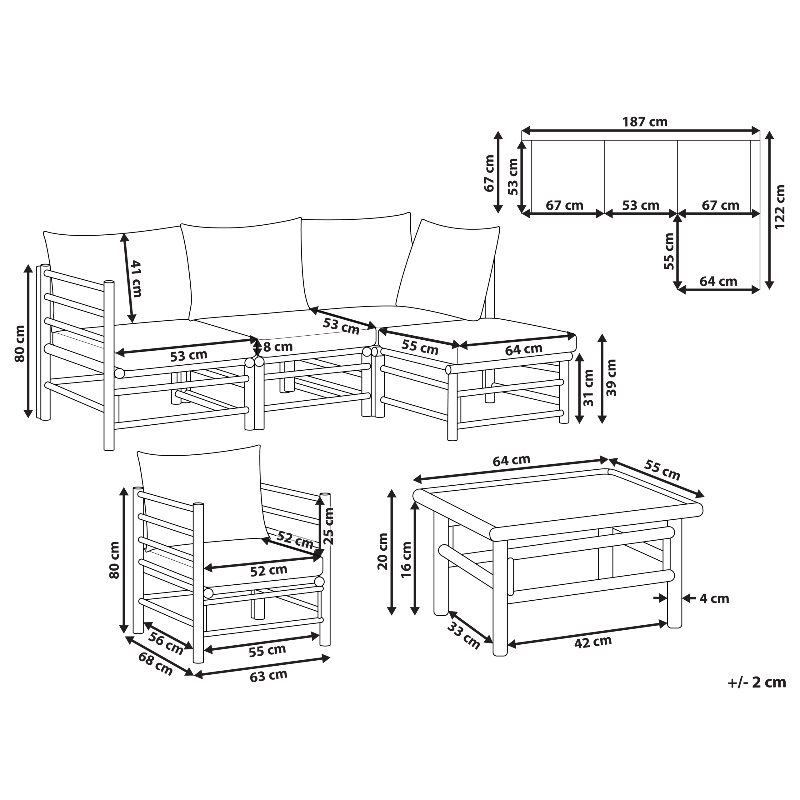 Bambu sohvaryhmä puutarhaan. Luo täydellinen ulkotila tällä bambusta valmistetulla sohvaryhmällä, joka täydentää kauniisti ulkotilan sisustusta. Monipuolisessa sohvaryhmässä yhdistyy boho-tyylin rentous, bambupuun kestävyys ja mukavat polyesteripehmusteet, joissa on irrotettavat päälliset vaivattoman ylläpidon varmistamiseksi. Modulaarinen muotoilu sopii erinomaisesti puutarhaan ja terassille, sillä voit muuntaa kokonaisuutta ja päivittää ulkotilan ilmettä käden käänteessä.