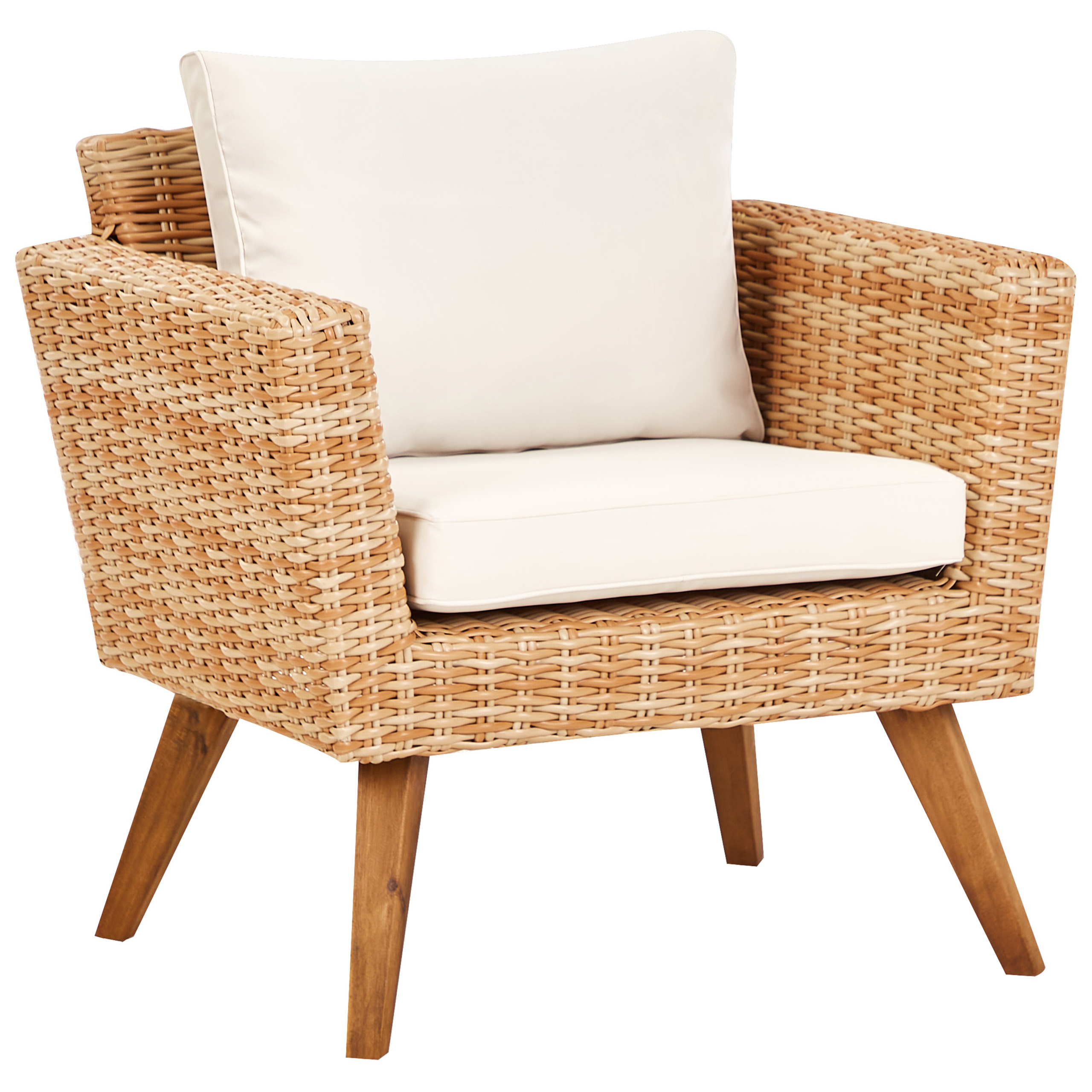 Rustiikkinen istuinryhmä sohvapöydällä. Nauti pitkistä, rennoista kesäilloista puutarhassasi tai terassillasi rustiikkisella ulkosohvaryhmällä. Tämä viidelle hengelle sopiva setti sisältää sohvan kolmelle, kaksi nojatuolia ja sohvapöydän, joiden rungot ovat vaalealla polyrottingilla päällystettyä terästä. Retrotyyliset kaltevat jalat ovat akasiapuuta. Korkealaatuiset säänkestävät materiaalit takaavat pitkäikäisyyden, ja paksut luonnonvalkoiset pehmusteet tarjoavat erinomaisen istumamukavuuden. Käytännöllinen sohvapöytä on viimeistelty karkaistulla lasitasolla. Trendikäs setti tuo boheemia charmia minkä tahansa tyyliseen ulkotilaan.