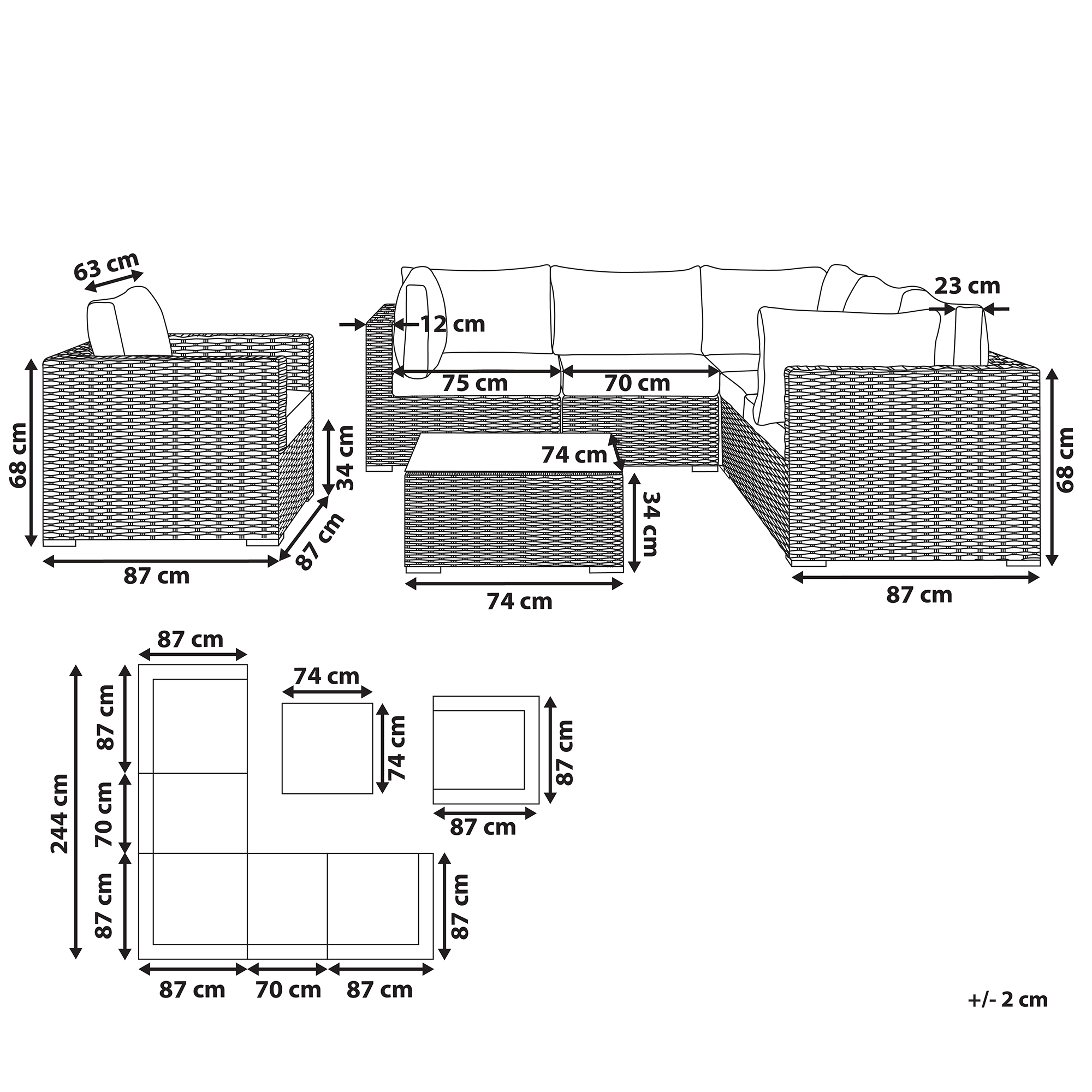 Hintaan sisältyy: 1 x Sohvapöytä, 2 x Istuin ilman käsinojia, 1 x Nojatuoli, 3 x Kulmaosa, 9 x Selkänojan tyyny, 6 x Istuintyyny