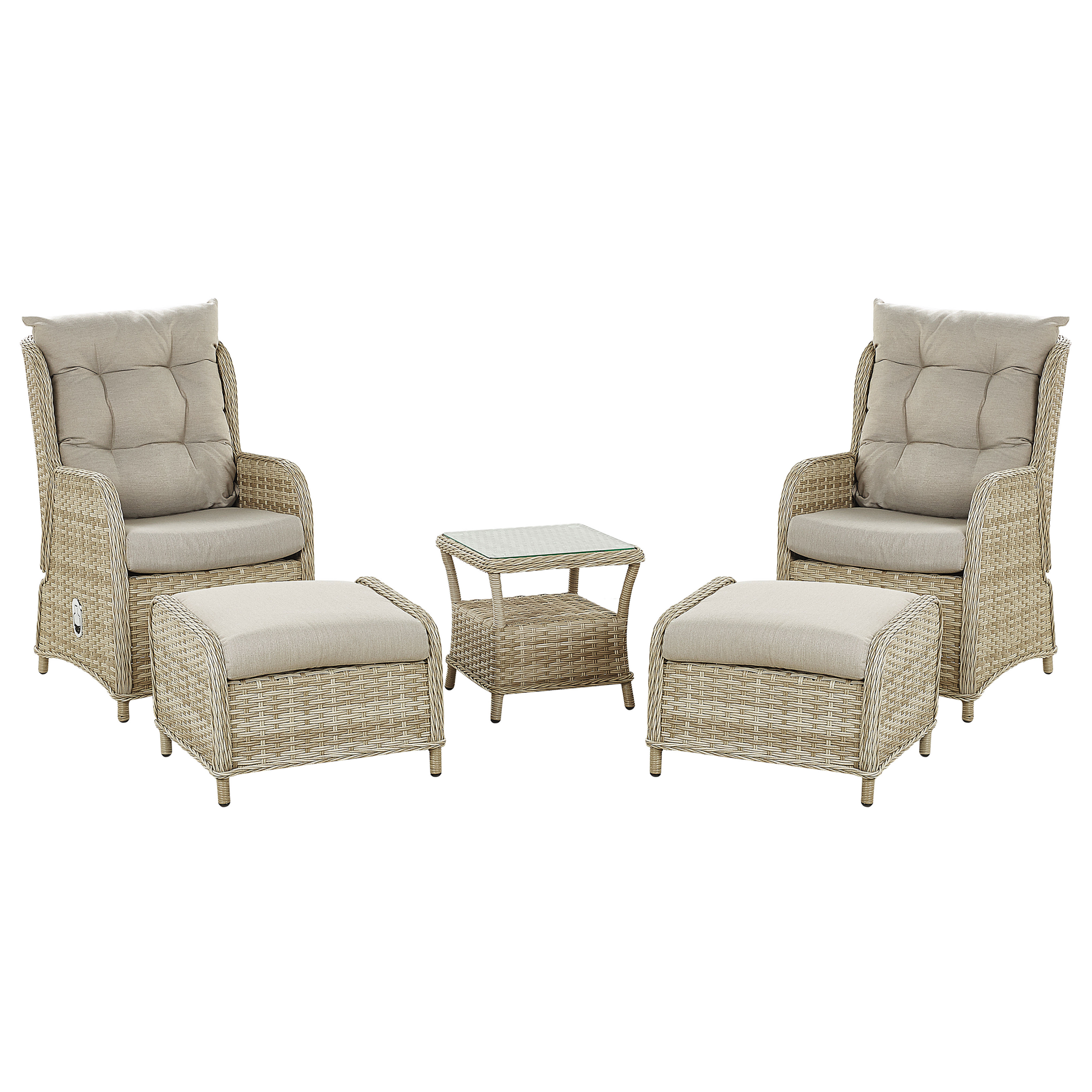 Boheemi puutarhan nojatuoliryhmä kallistustoiminnolla. Rentoudu rauhassa tässä mukavassa puutarhasetissä. Se sisältää kaksi korkeaselkäistä, kallistettavaa nojatuolia, kaksi yhteensopivaa jakkaraa ja muhkeat tyynyt, joten se tarjoaa viihtyisän oleskelupaikan lämpiminä iltoina. Pienessä sohvapöydässä on karkaistu lasitaso ja kätevä hylly, jonne sopii kirja tai koriste. Alumiinirungot ja kestävä polyrottinkipunos kestävät UV-säteilyä, kosteutta ja vaihtelevia sääolosuhteita. Istuintyynyjen päälliset voi pestä tai vaihtaa nopeasti kätevien vetoketjujen ansiosta. Istuinryhmä sopii erinomaisesti yhteen sekä perinteisten että boheemien sisustustarvikkeiden kanssa.