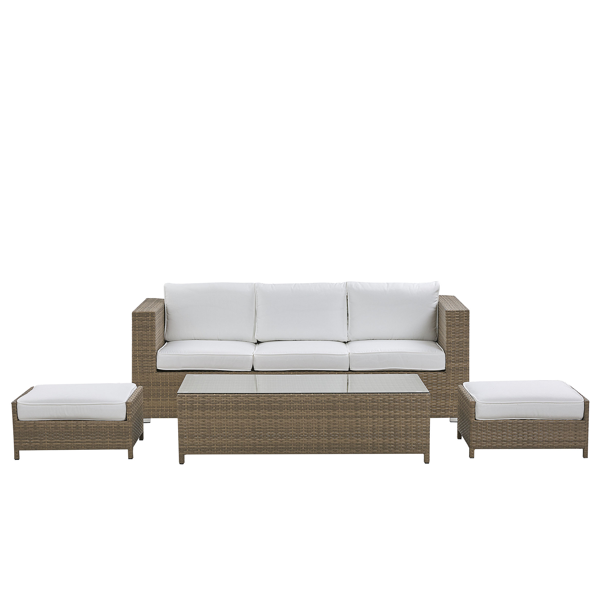 Klassinen 3-istuttava sohvaryhmä. Anna ulkotilallesi uusi ilme tällä klassisella ulkosohvaryhmällä. Yksinkertaisen mutta ajattoman muotoilunsa ansiosta kalusteryhmä sopii täydellisesti moderneihin, perinteisiin tai nykyaikaisiin sisustuksiin. Vankasta alumiinista ja kestävästä polyrottingista valmistetuissa kalusteissa on paksut valkoiset pehmusteet, jotka tarjoavat mukavuuden. Käytännöllisen sohvapöydän leveä taso on viimeistelty karkaistulla lasilla. Mukana tulevat rahit on helppo asettaa sohvapöydän alle, kun ne eivät ole käytössä.