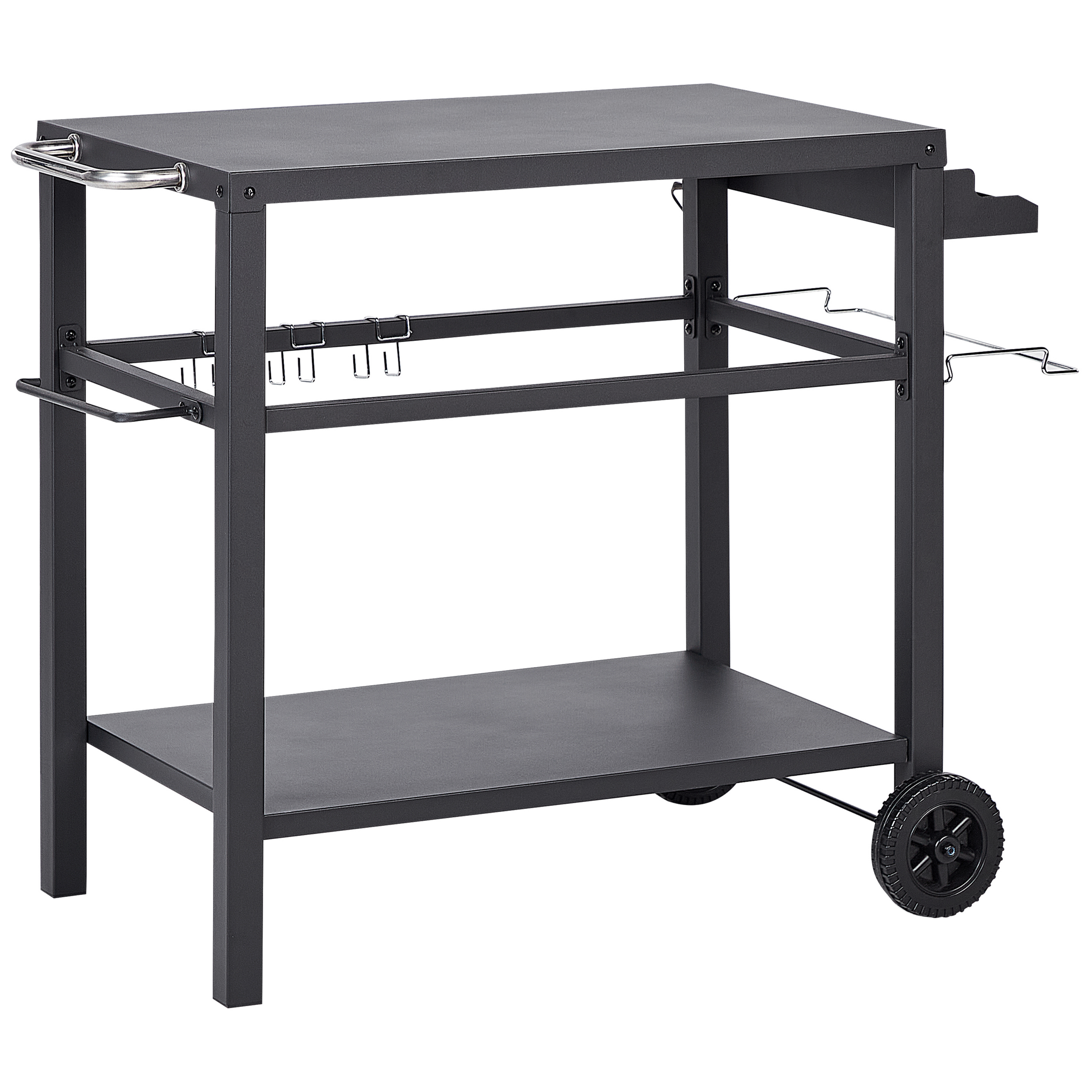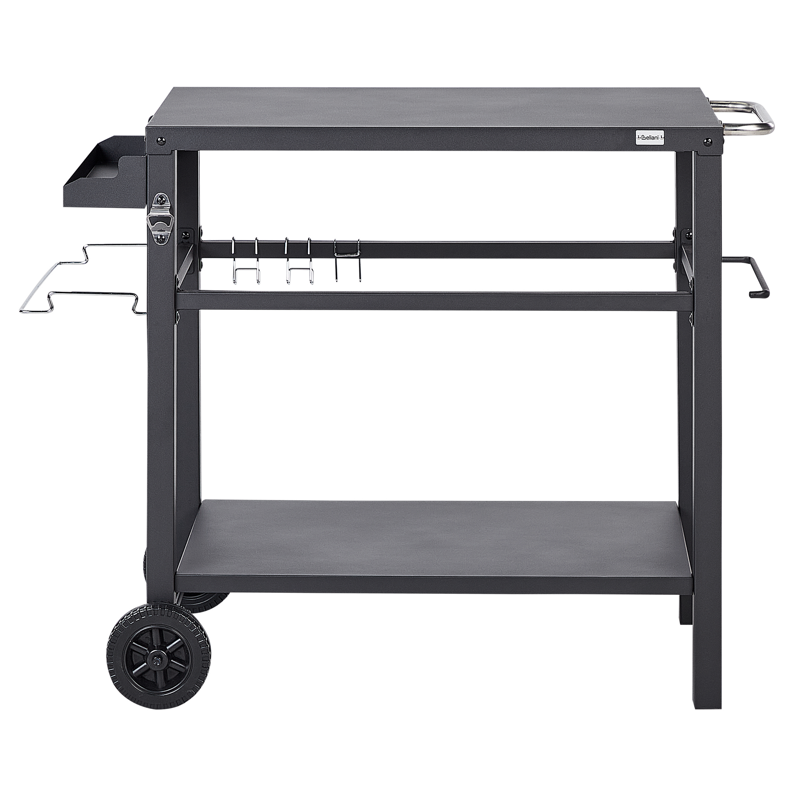 Moderni tarjoiluvaunu ulkokäyttöön. Tämä ulkotarjoiluvaunu on tyylikäs ja käytännöllinen lisä mille tahansa terassille. Se on valmistettu kestävästä jauhemaalatusta teräksestä ja siinä on tukeva taso, joka sopii täydellisesti ruoan tarjoiluun. Kätevä pyyheteline ja ripustimet pitävät välttämättömät tarvikkeet käden ulottuvilla, kun taas alempi hylly tarjoaa runsaasti säilytystilaa ruokailuvälineille, juomille tai muille esineille. Vaunussa on pyörät, jotka helpottavat liikkumista, joten se sopii erinomaisesti vieraiden viihdyttämiseen tai aterioiden nauttimiseen ulkona.