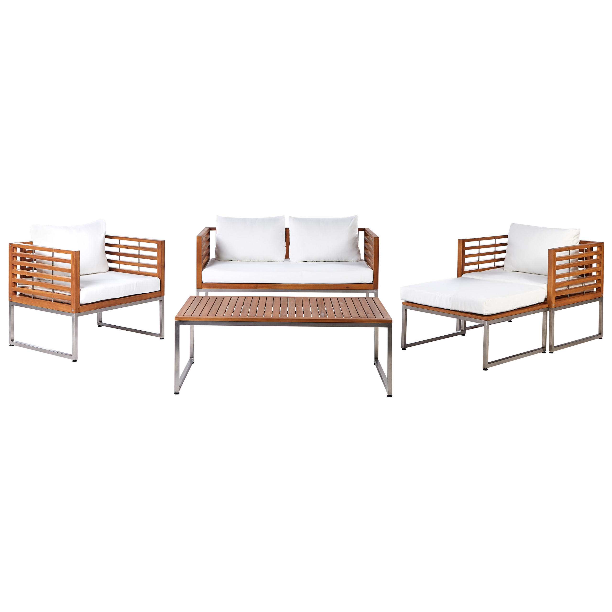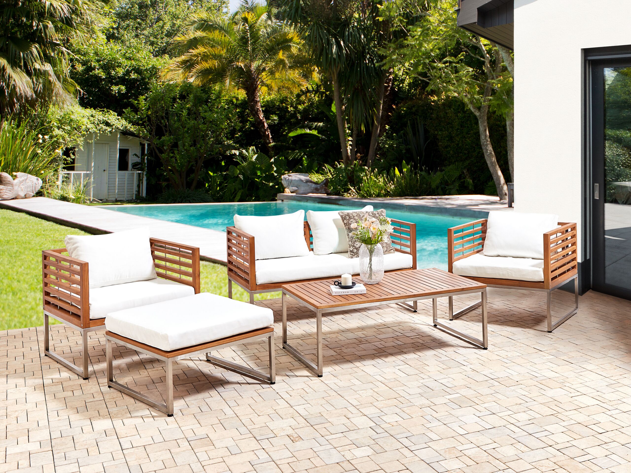 Tyynynpäälliset ulkosohvasettiin. Käytännöllisen tyynynpäällissetin avulla voit antaa suosikkipuutarhakalusteillesi uuden ilmeen. Valkoisen värinen setti sisältää neljä istuin- ja selkänojatyynynpäällistä. Päälliset on valmistettu korkealaatuisesta polyesteristä, jossa on kosteutta ja likaa hylkivä erikoispinnoite, eivätkä ne vaalene UV-säteilyn vaikutuksesta. Piilotettujen vetoketjujen ansiosta helppohoitoiset päälliset ovat irrotettavissa ja pestävissä.