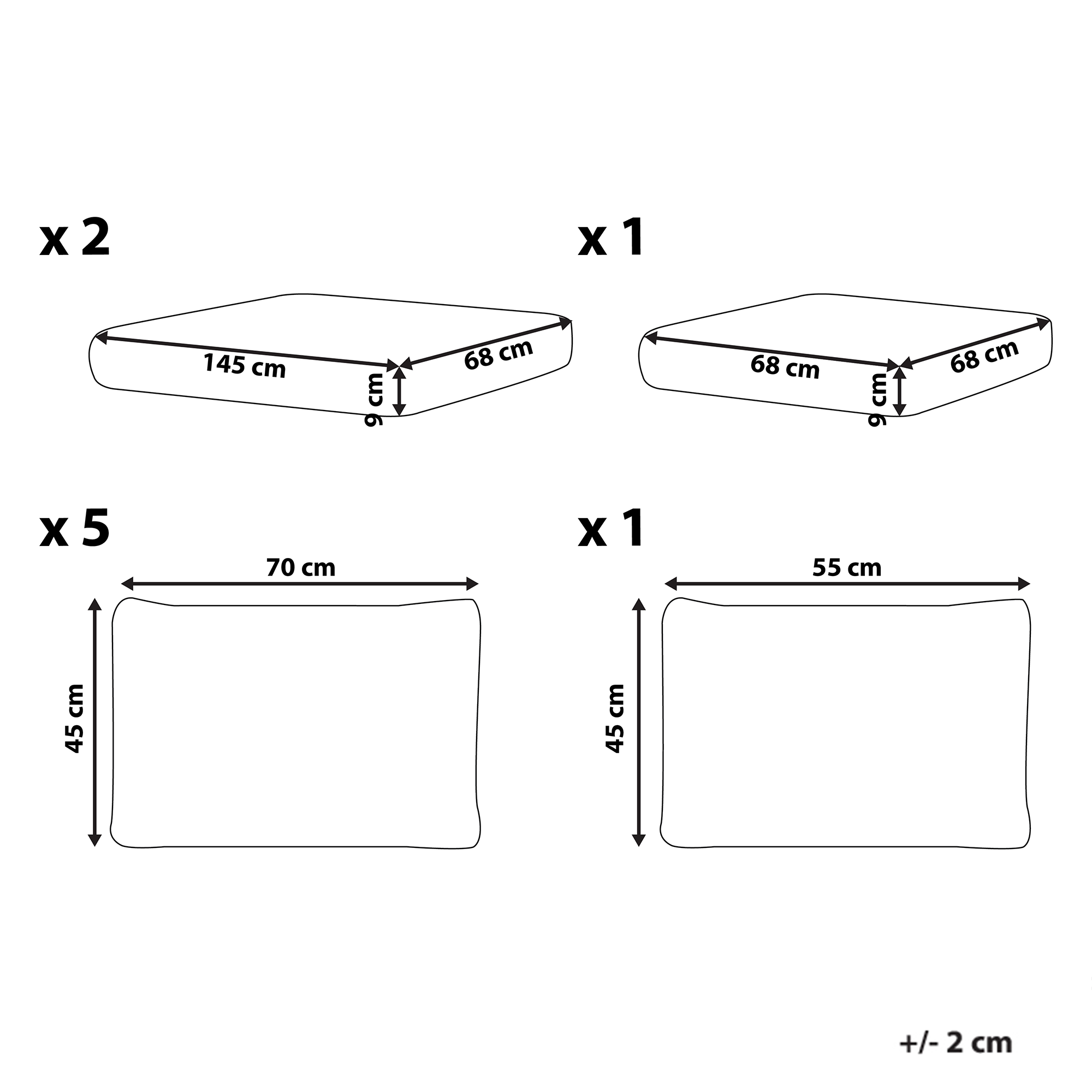 Lisätiedot: Mikäli ostat tyynynpäällissetin lisävarusteeksi jo aiemmin ostamaasi Beliani-ulkokalustesettiin, otathan huomioon, etteivät ne ei välttämättä ole identtiset tarjoukseen alun perin sisältyneiden mallien kanssa. Varmistaaksesi tuotteittesi yhteensopivuuden, otatahan yhteyttä asiakaspalveluumme.