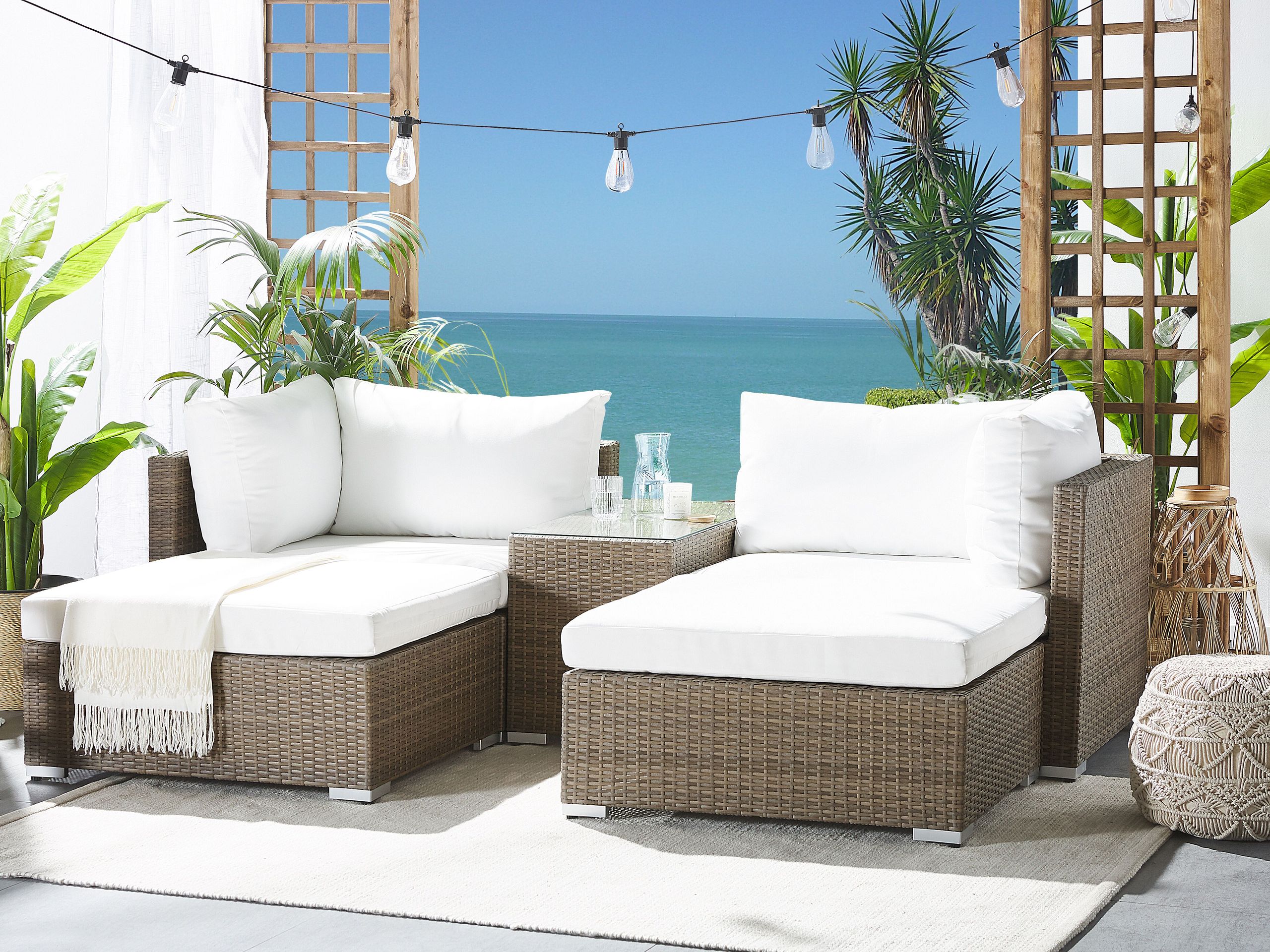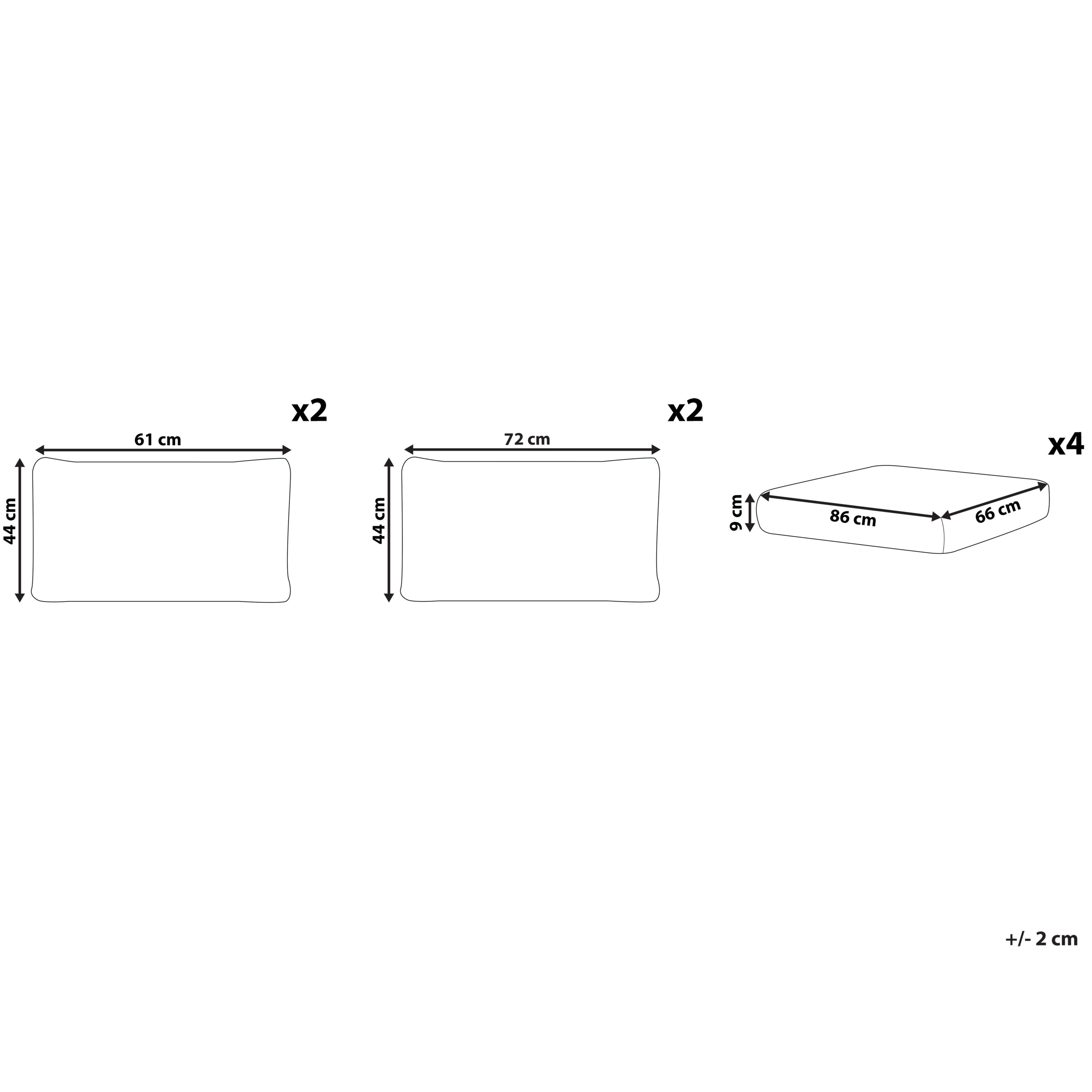 Lisätiedot: Mikäli ostat tyynynpäällissetin lisävarusteeksi jo aiemmin ostamaasi Beliani-ulkokalustesettiin, otathan huomioon, etteivät ne ei välttämättä ole identtiset tarjoukseen alun perin sisältyneiden mallien kanssa. Varmistaaksesi tuotteittesi yhteensopivuuden, otatahan yhteyttä asiakaspalveluumme.