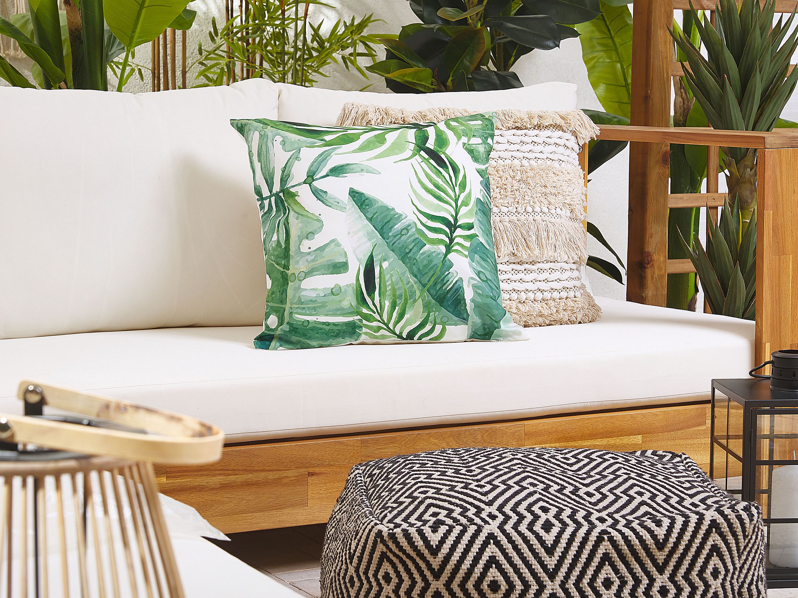 Kasvikuvioitu koristetyynysetti ulkokäyttöön. Tämä tyylikäs ulkokoristetyynysetti on valmistettu helppohoitoisesta ja kestävästä polyesteristä, joten se sopii täydellisesti parvekkeelle tai terassille. Päällisen vedenkestävyyden ansiosta sinun ei tarvitse huolehtia nopeasti muuttuvasta säästä. Paksu täyte takaa tyynyn pehmeyden.