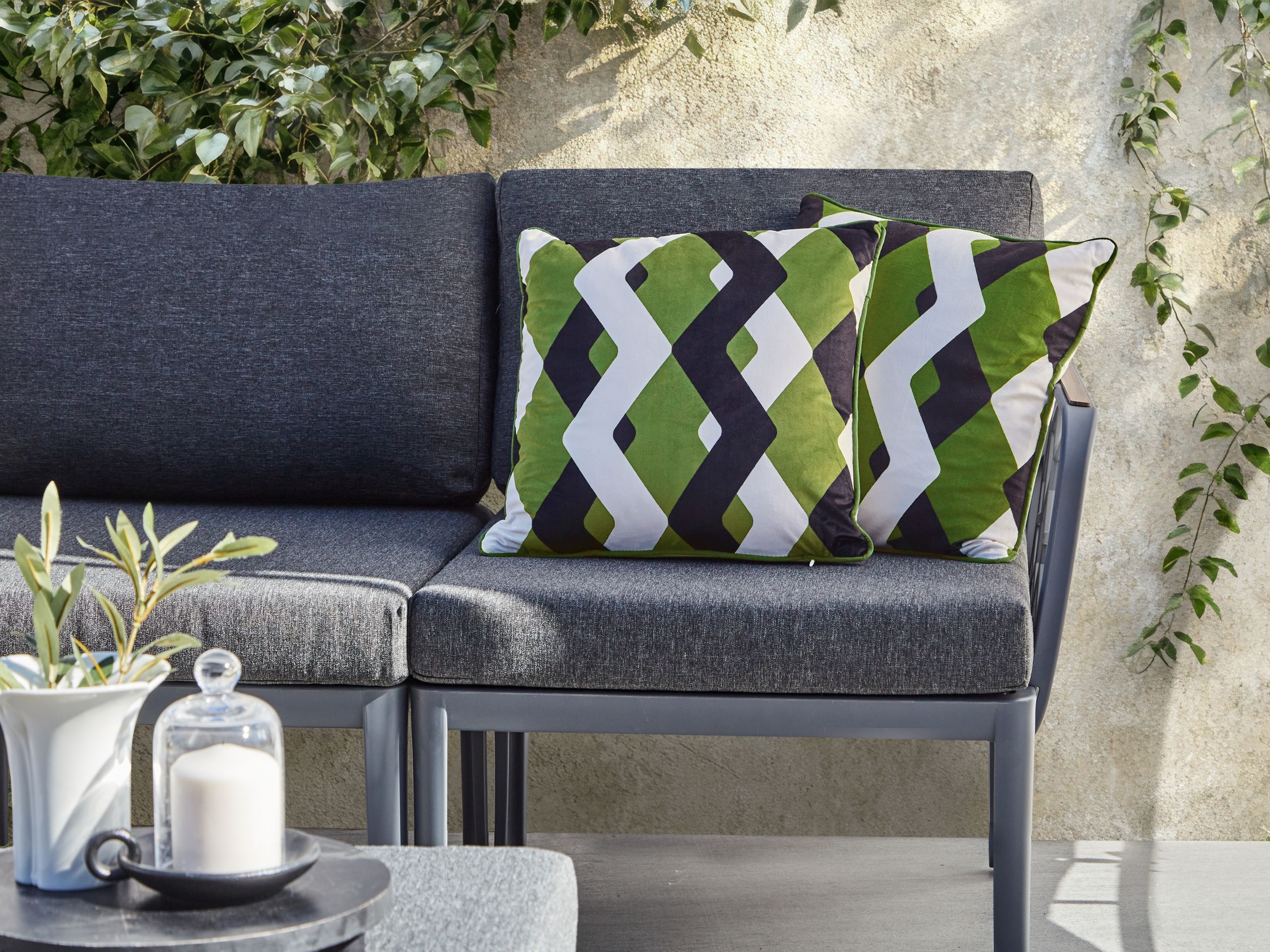 Ominaisuudet: Koristeellinen mutta käytännöllinen, Modernia tyyliä terassille ja puutarhaan, Sopii sekä sisä- että ulkokäyttöön, Korkealaatuinen, Irrotettavat ja vettä hylkivät tyynynpäälliset