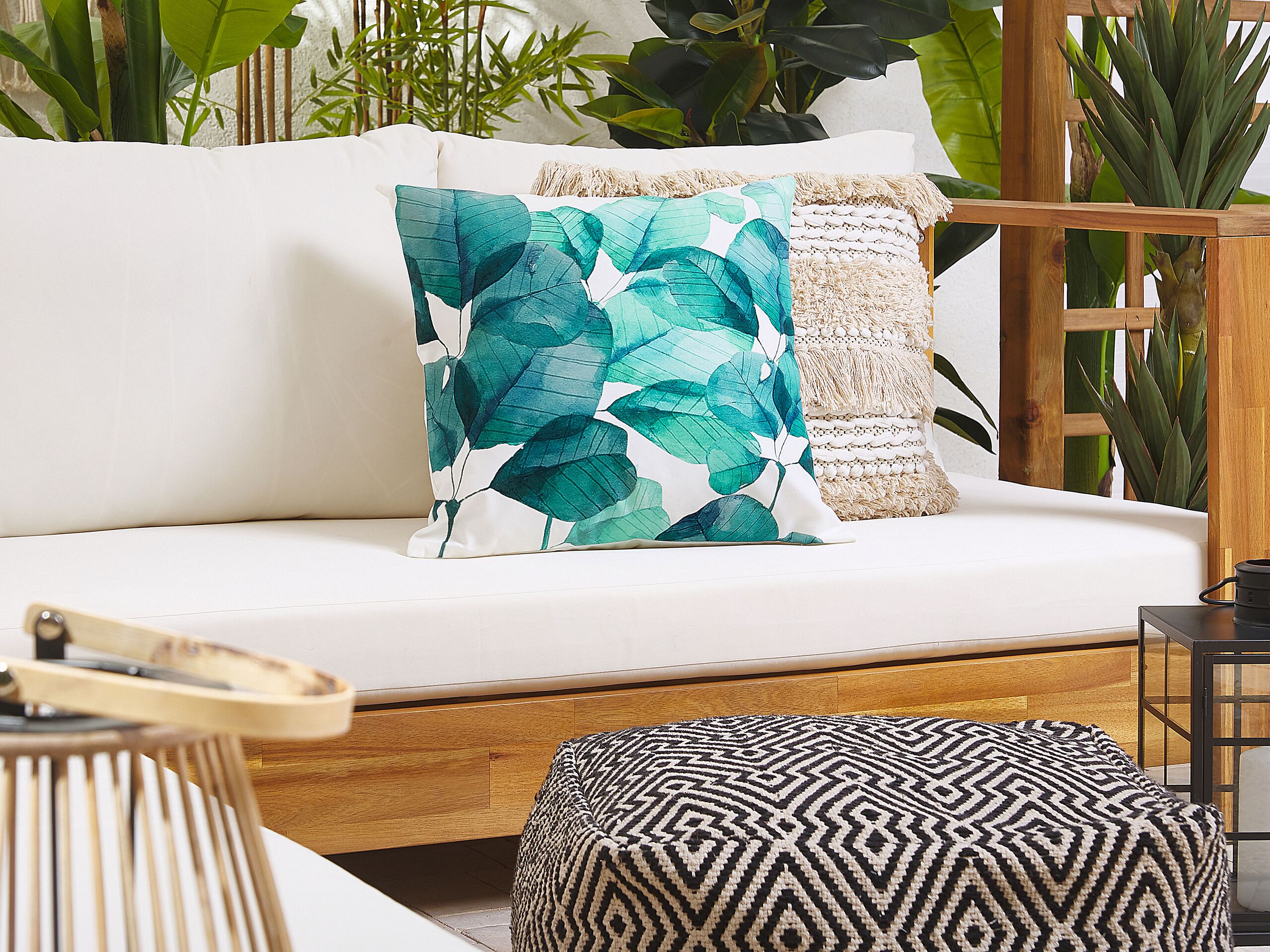 Kaunis ulkotyynysetti lehtikuviolla. Luo raikas tunnelma parvekkeelle, takapihalle tai terassille näiden värikkäiden tyynyjen avulla. Tyynyn etuosassa oleva sinivihreä lehtikuvio on sopii hyvin niin moderniin kuin boho-tyyliseen sisustukseen. Polyesterista valmistettu tyynypäällinen on kestävää ja helppohoitoista, kun taas täyte on muhkeaa ja pehmeää.