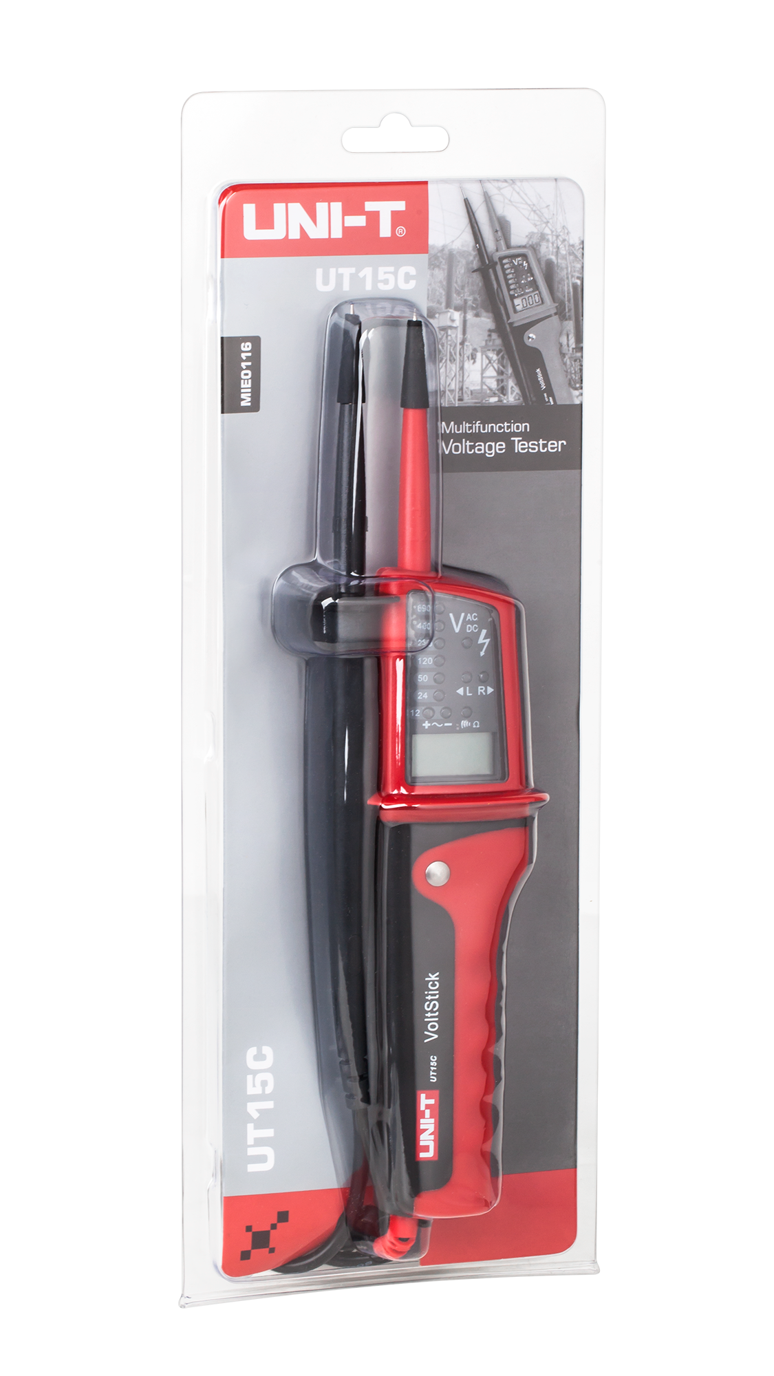 UT15C:n avulla voit mitata AC/DC-jännitettä laajalla alueella 12 V - 690 V, tarkkuudella ±(3 % + 5) jännitteille 24 V - 690 V. Laite on varustettu LED-merkkivalolla, joka näyttää selvästi nykyisen jännitteen. Testeri tarjoaa myös vaihejärjestyksen testaustoiminnon jännitteille 100 V - 690 V ja yksivaiheisen jännitteen tunnistuksen taajuudella 50 Hz - 400 Hz, mikä on olennaista työskenneltäessä kolmivaiheasennusten kanssa.
