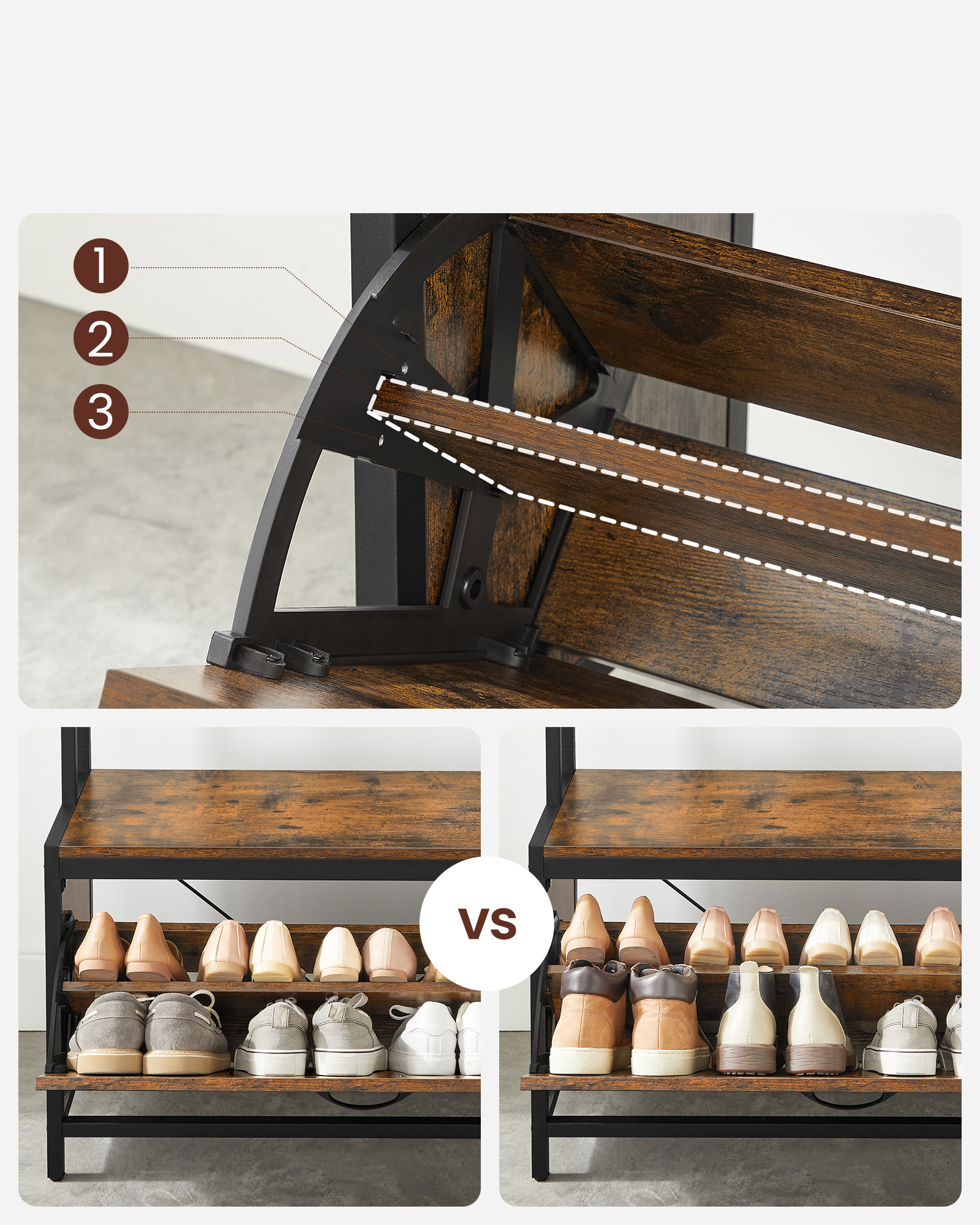 - Säädettävä kenkähyllyväli eri korkeuksille ja kengille.