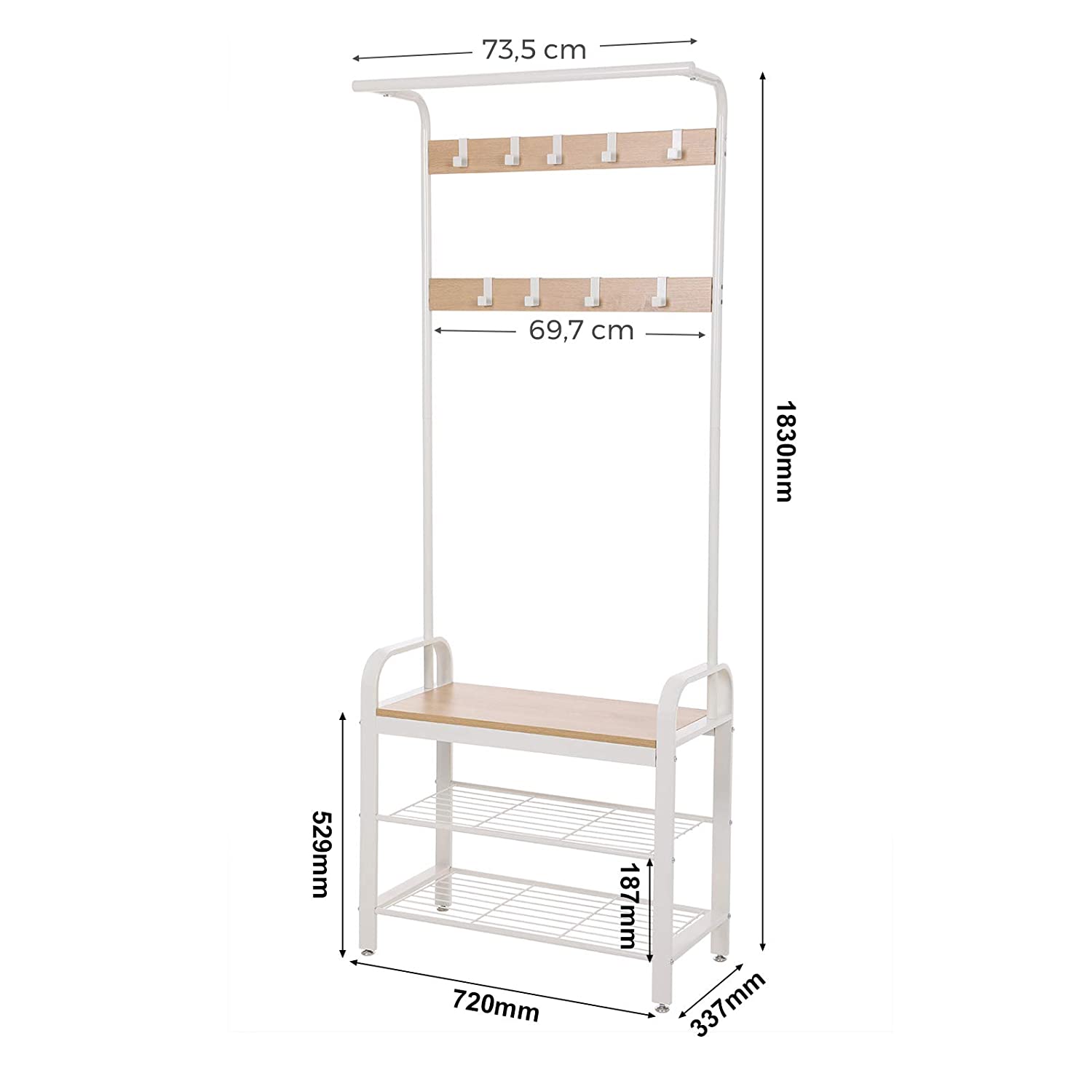 Pidä eteinen siistinä yhdellä kalusteella. Näppärä naulakko kokoaa takit, laukut ja asusteet yhteen paikkaan. Kaksi kenkähyllyä pitävät jalkineet järjestyksessä ja tukeva istuin helpottaa kenkien pukemista. Säädettävät jalat varmistavat helpon tasauksen myös epätasaisella lattialla.