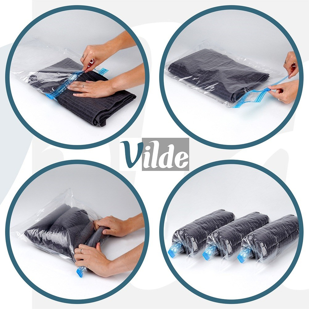10 kompressiopussin sarja, jossa on tiivis tiiviste. Pussit sopivat yleisesti ja ovat hyödyllisiä jokaisessa kodissa. Pussit ovat uudelleenkäytettäviä ja uudelleensuljettavia. Kompressiopussit ovat käytännöllinen ratkaisu, joka säästää tilaa matkatavaroissasi ja vaatekaapissasi. Kolmen eri koon ansiosta ne sopivat ihanteellisesti sekä pienten että suurten tavaroiden säilytykseen. Ne suojaavat kosteudelta, pölyltä ja epämiellyttäviltä hajuilta. Alkuperäinen Vilde-tuote. Valmistettu eurooppalaisten standardien mukaisesti.