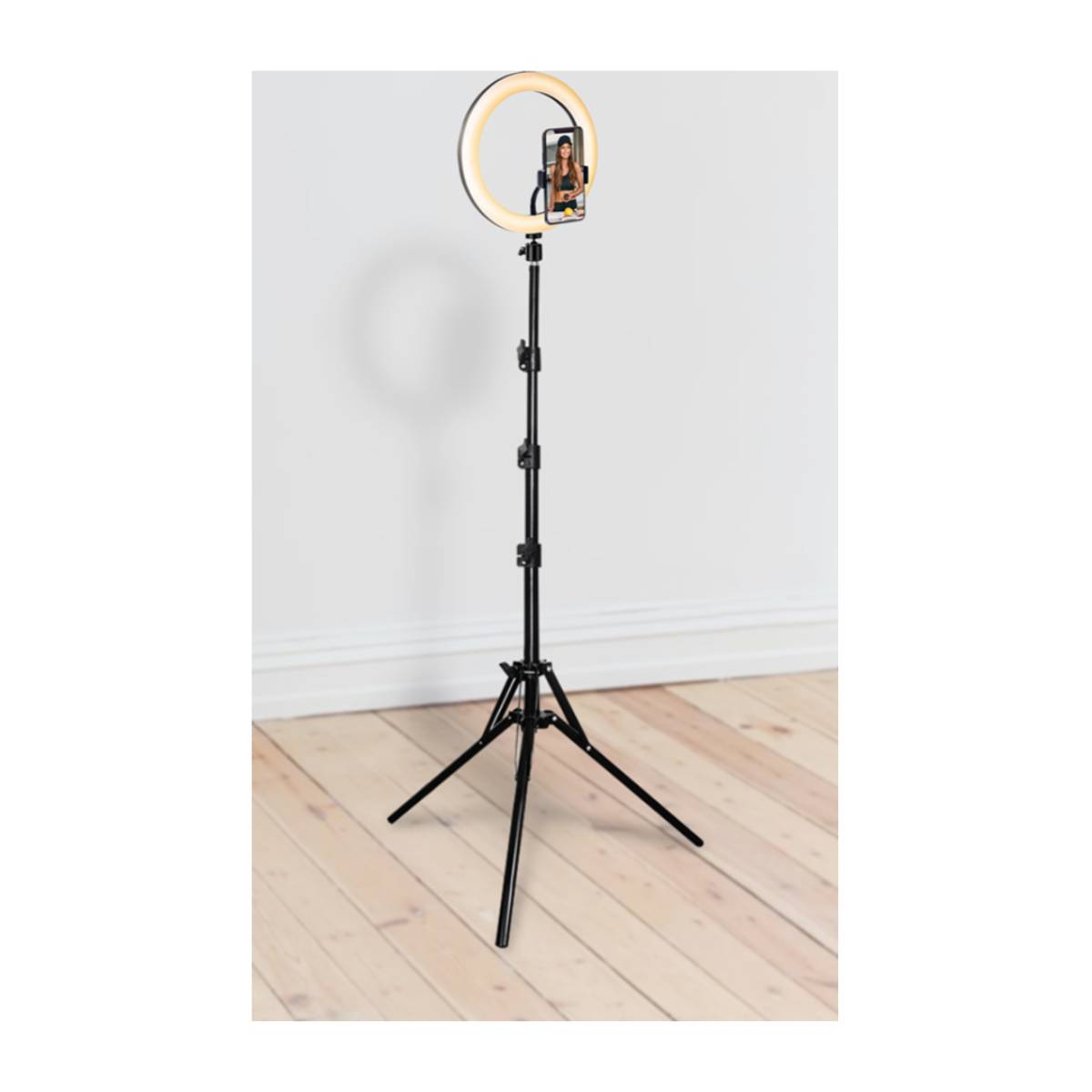 Lisää ammattimaista valaistusta valokuviin ja videoihin tällä LED-rengasvalolla ja luo laadukasta sisältöä missä tahansa oletkin. Tämä rengasvalo tarjoaa 3 kirkkaustasoa ja 26 RGB-tilaa, joilla luot täydellisen tunnelman kaikkiin projekteihisi. Sen jalusta, jota voi säätää jopa 1,60 metriin asti, ja 360° kääntyvä älypuhelimen pidike antavat sinulle optimaalisen joustavuuden kuvaamiseen mistä tahansa kulmasta.