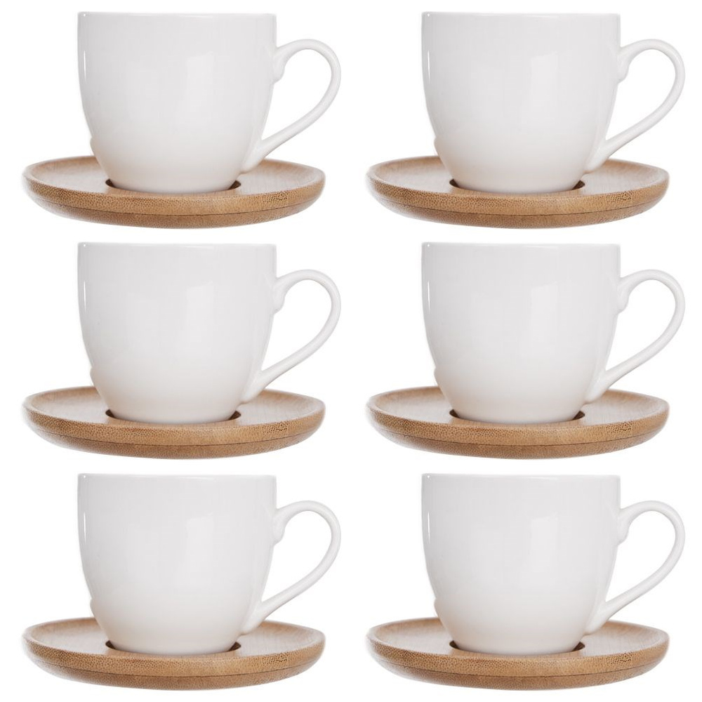 HYÖDYLLINEN - Kuuden kupin setti bambu-lautasilla lahjapakkauksessa. Kuppien enimmäistilavuus on 100 ml, halkaisija 6,5 cm ja korkeus 6 cm. Lautasen halkaisija on 9 cm ja korkeus 1 cm.