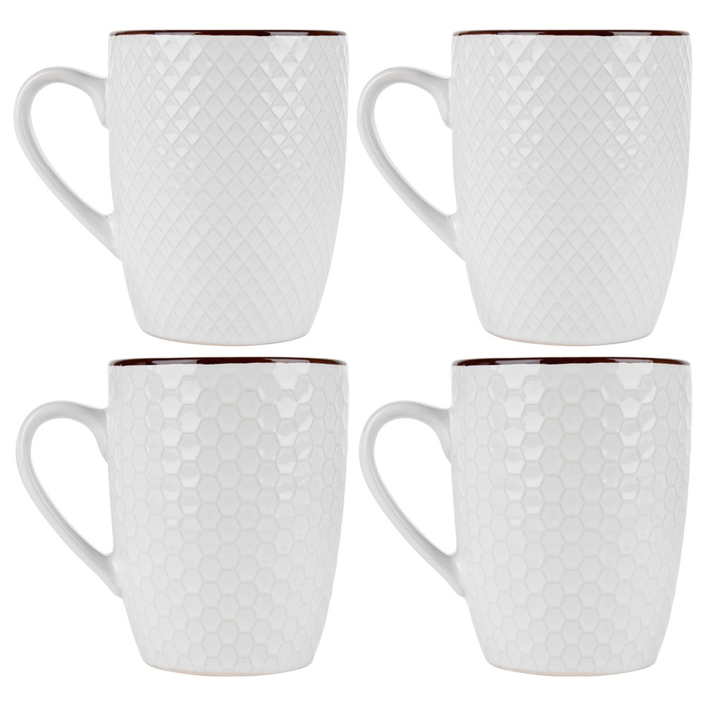 4 mukin setti, tilavuus 400 ml - Neljän kahvallisen mukin setti juomien nauttimiseen, ihanteellinen jokapäiväiseen käyttöön. Mukien mitat ovat 12 x 8,7 x 11 cm. Kunkin mukin enimmäistilavuus on 400 ml, mutta mukavan käytön takaamiseksi suositeltu tilavuus on 270 ml, kuten etiketissä ilmoitetaan. Nämä mukit sopivat ihanteellisesti teen, kahvin, kaakaon ja muiden juomien nauttimiseen. Pakattu lahjapakkaukseen.