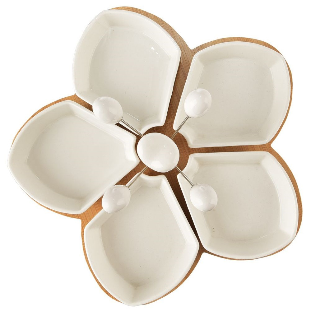 KÄYTÄNNÖLLINEN - Viiden kulhon setti kukanmuotoisella tarjottimella. Setti sisältää myös neljä alkupalavarrasta. Setin ulkomitat ovat 28,5 x 28 x 11 cm. Setti sisältää 10 x 11,5 x 3 cm:n kokoiset kulhot, joiden tilavuus on 100 ml, ja 8 cm:n pituiset vartaat. Laudan mitat ovat 28,5 x 28 cm ja korkeus 1 cm.