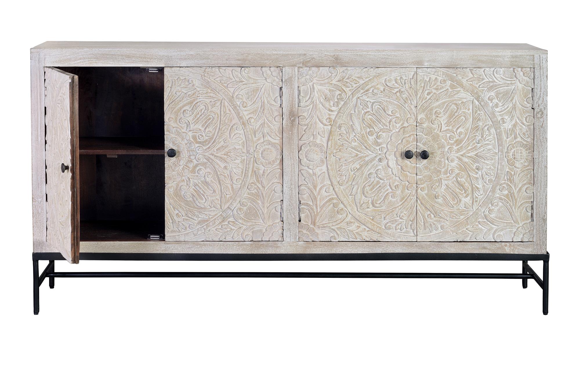 Neliovinen senkki mangopuusta, jossa sisähyllyt. Oven yksityiskohdat on veistetty käsin. Jalan korkeus: 19 cm. Sisähyllyn korkeus: 29 cm. Oven mitat: 59 cm korkea x 38 cm leveä. Koska kyseessä on luonnonpuusta valmistettu ja käsintehty kappale, siinä saattaa säilyä alkuperäiset oksankohdat ja syykuviot, ja siksi siinä voi olla pieniä värivaihteluita.