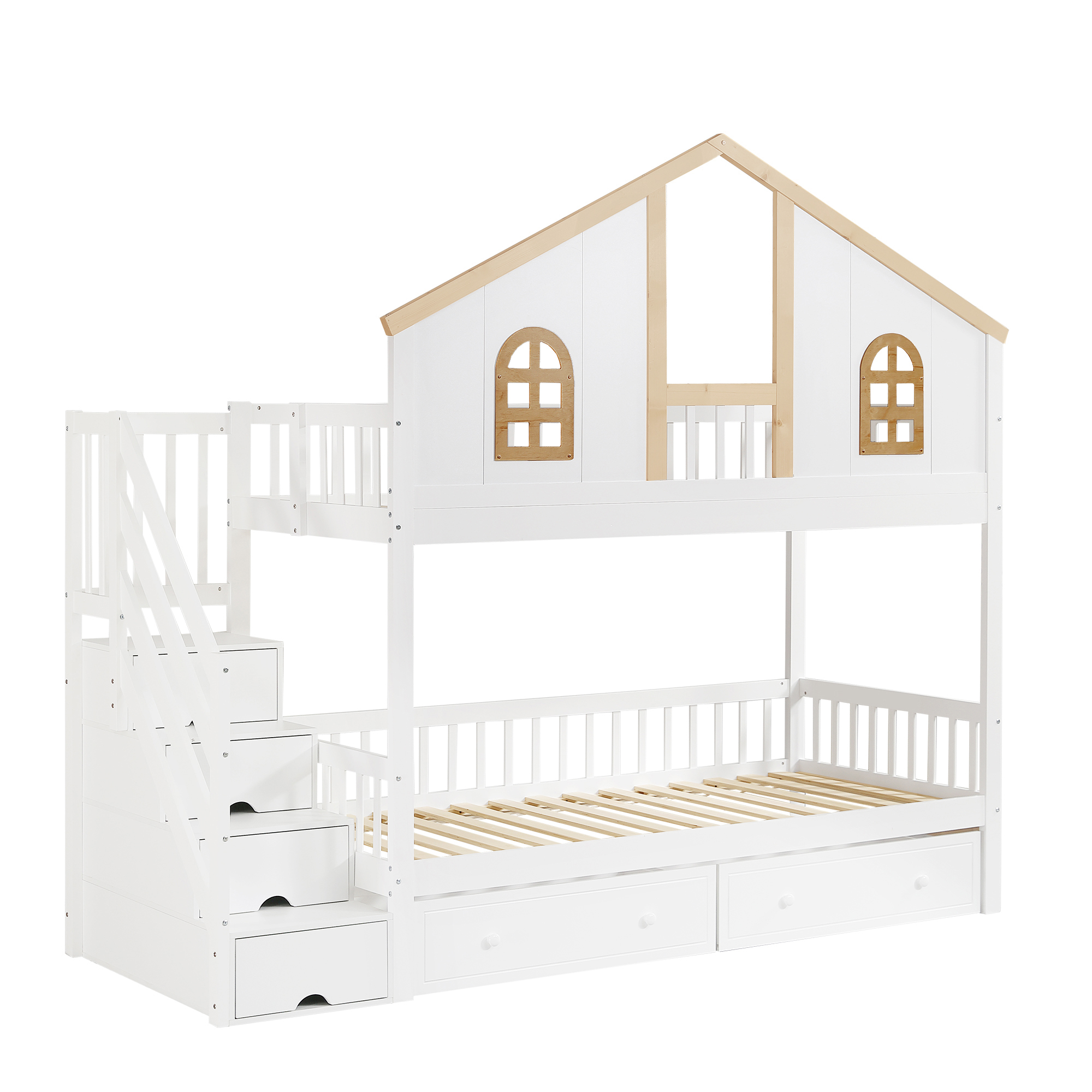 Värillinen kaidekerrossänky, 90x200cm, ikkuna, 2 laatikkoa ja portaat, valkoinen