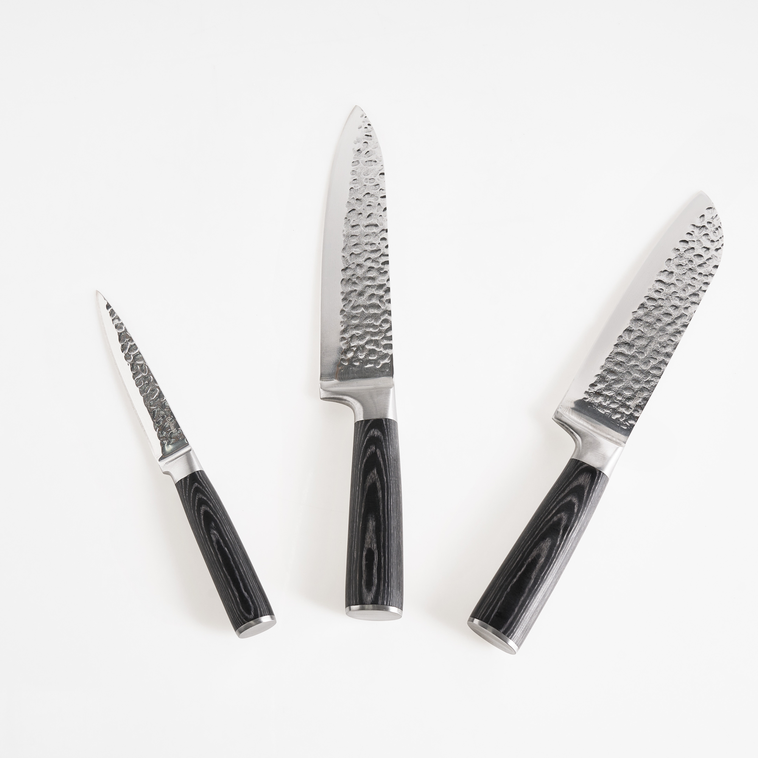 3-osainen käsin teroitettu veitsisetti. Leikkaa ja viipaloi kuin ammattikokki tällä tyylikkäällä kolmiosaisella käsin teroitetulla veitsisetillä. Elegantissa laatikossa toimitettu setti sisältää kokkiveitsen, santoku-veitsen, joka on aasialaistyylinen yleisveitsi ja sopii tarkkaan siivutukseen, sekä yleisveitsen, jotka ovat välttämättömiä työkaluja kaikissa keittiöissä. Jokainen terä on valmistettu ruostumattomasta damaskiteräksestä, joka on huolellisesti kiillotettu useassa vaiheessa ainutlaatuisen kuvion luomiseksi sekä korkean kovuuden, poikkeuksellisen terävyyden ja vertaansa vailla olevan terän laadun varmistamiseksi. Ergonomiset koivukahvat täydentävät terien ulkonäköä ja takaavat turvallisen otteen, mikä varmistaa tarkkuuden jokaisella leikkauksella.