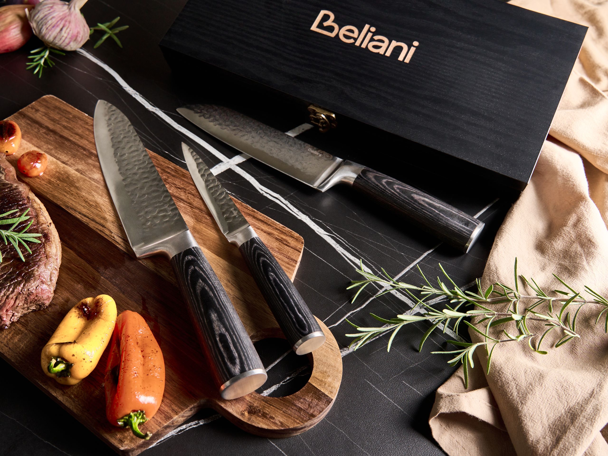 Ominaisuudet: Täydellinen lahja kotikokeille ja ammattilaisille, Setti toimitetaan tyylikkäässä laatikossa, Terän korkea HRC-kovuus takaa pitkäaikaisen laadun, Ammattitaidolla käsin teroitettu terä, Ergonominen kahva turvalliseen ja miellyttävään otteeseen