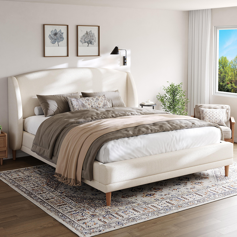 Tämä sänky on kokonaan verhoiltu ylellisellä bouclé-kankaalla, joka tuntuu pehmeältä ja jossa on runsas tekstuuri. Se tarjoaa poikkeuksellista mukavuutta ja lisää hienostuneen ja lämpimän vivahteen nukkumisalueellesi. Se säilyttää lämmön erinomaisesti, taaten lämmön ja mukavuuden myös kylminä kuukausina. Lisäksi se on erittäin joustavaa ja säilyttää muotonsa.