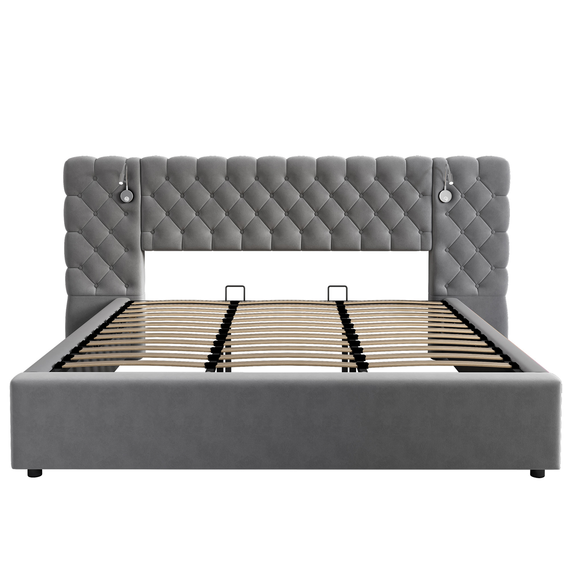 Verhoiltu sänky 180 x 200 cm, parisänky säilytystilalla ja LED-valaistuksella, sängynpääty, sametti, harmaa