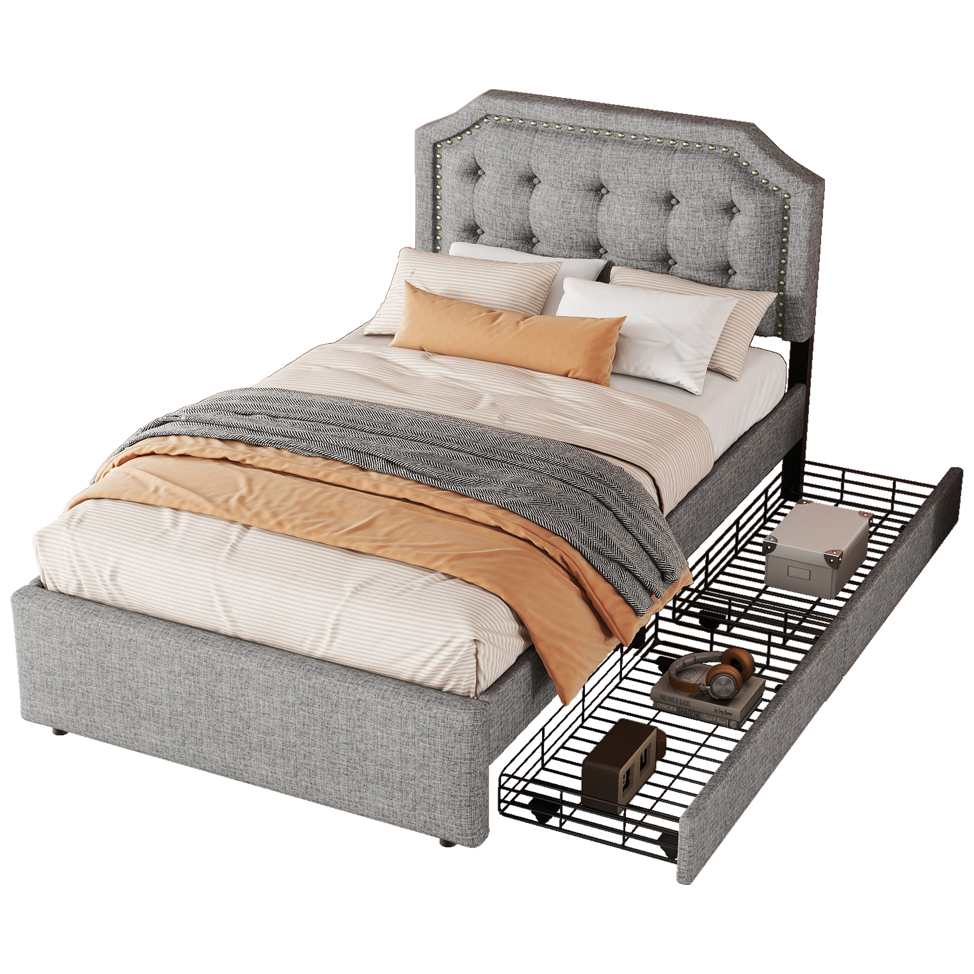 Verhoiltu sänky 90 x 200 cm, leveä parisänky, yhden hengen sänky koristeellisilla niiteillä, kaksi laatikkoa, harmaa