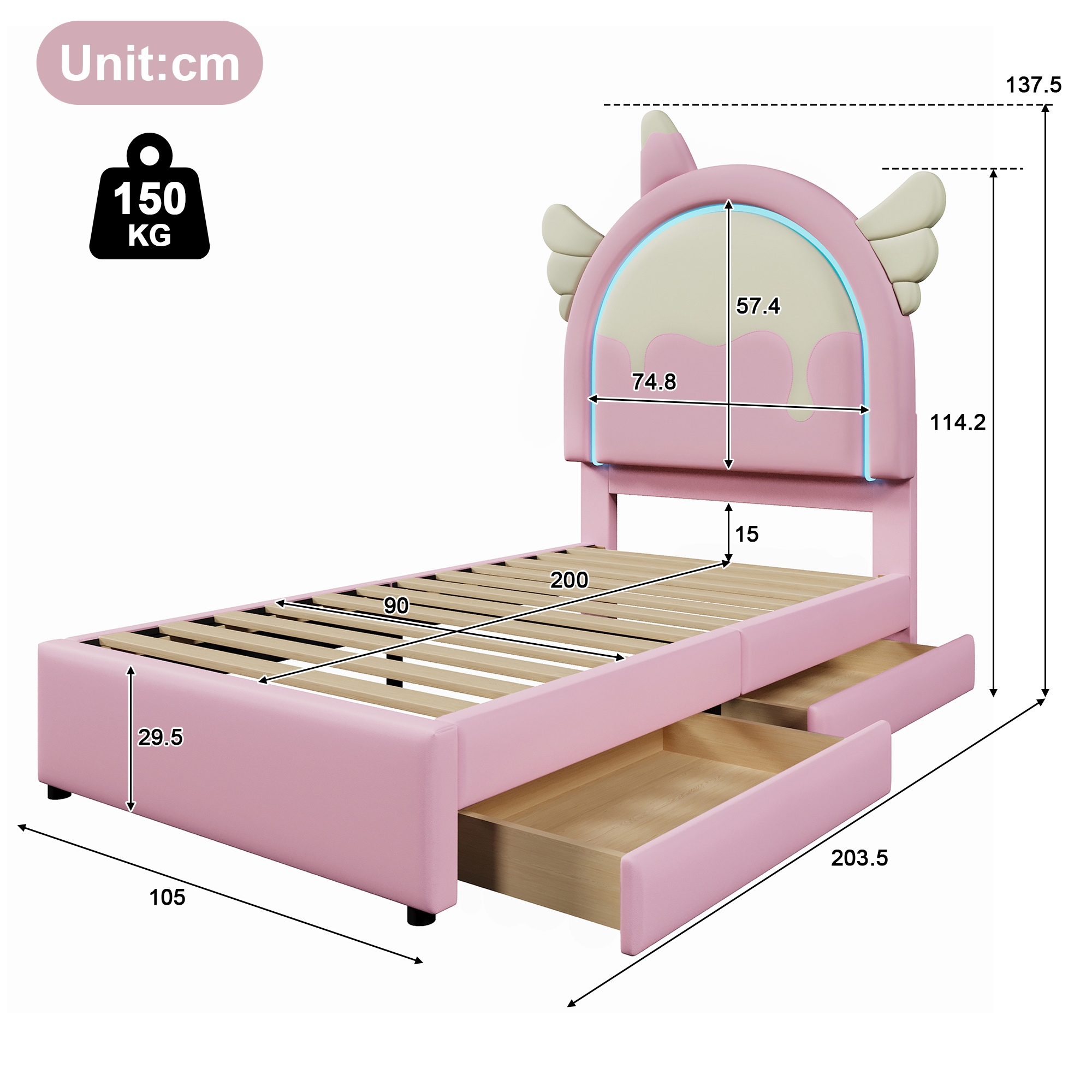 Verhoiltu sänky 90 x 200 cm, valolistalla ja kahdella laatikolla, yksisarvisen muotoinen, PU, pinkki