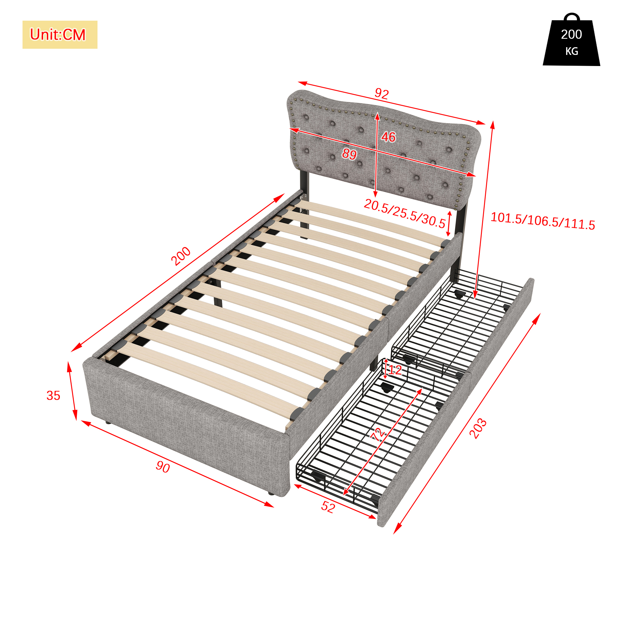 Verhoiltu sänky 90 x 200 cm, yhden hengen sänky kahdella laatikolla, sängynpääty koristeellisilla niiteillä, harmaa