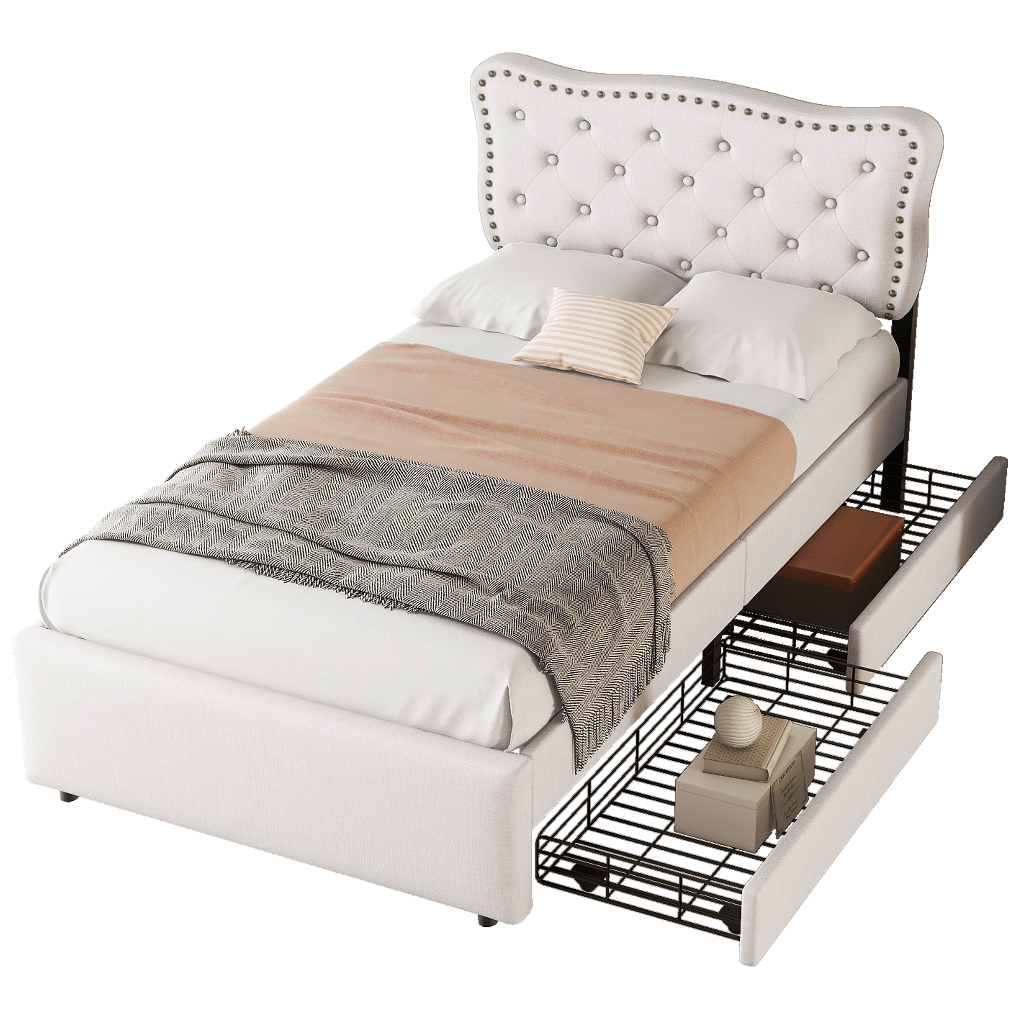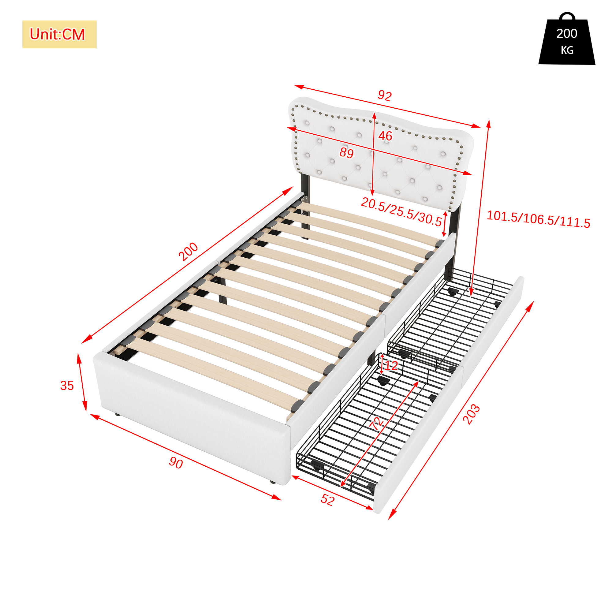 Verhoiltu sänky 90 x 200 cm, yhden hengen sänky kahdella laatikolla, sängynpääty koristeellisilla niiteillä, vaalea beige