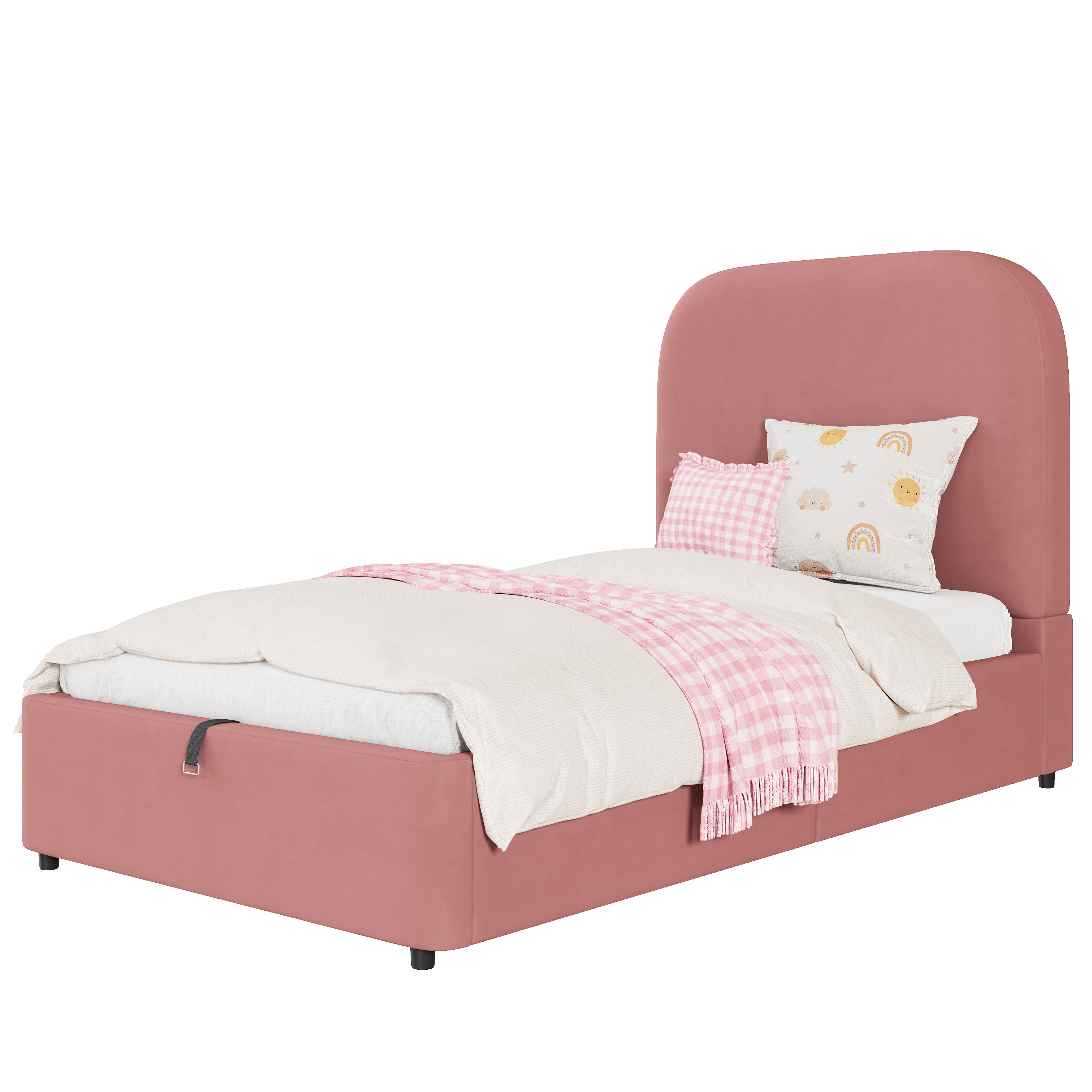 Verhoiltu sänky 90 x 200 cm, yhden hengen sänky säilytystilaa ja sängynpääty, sametti, pinkki