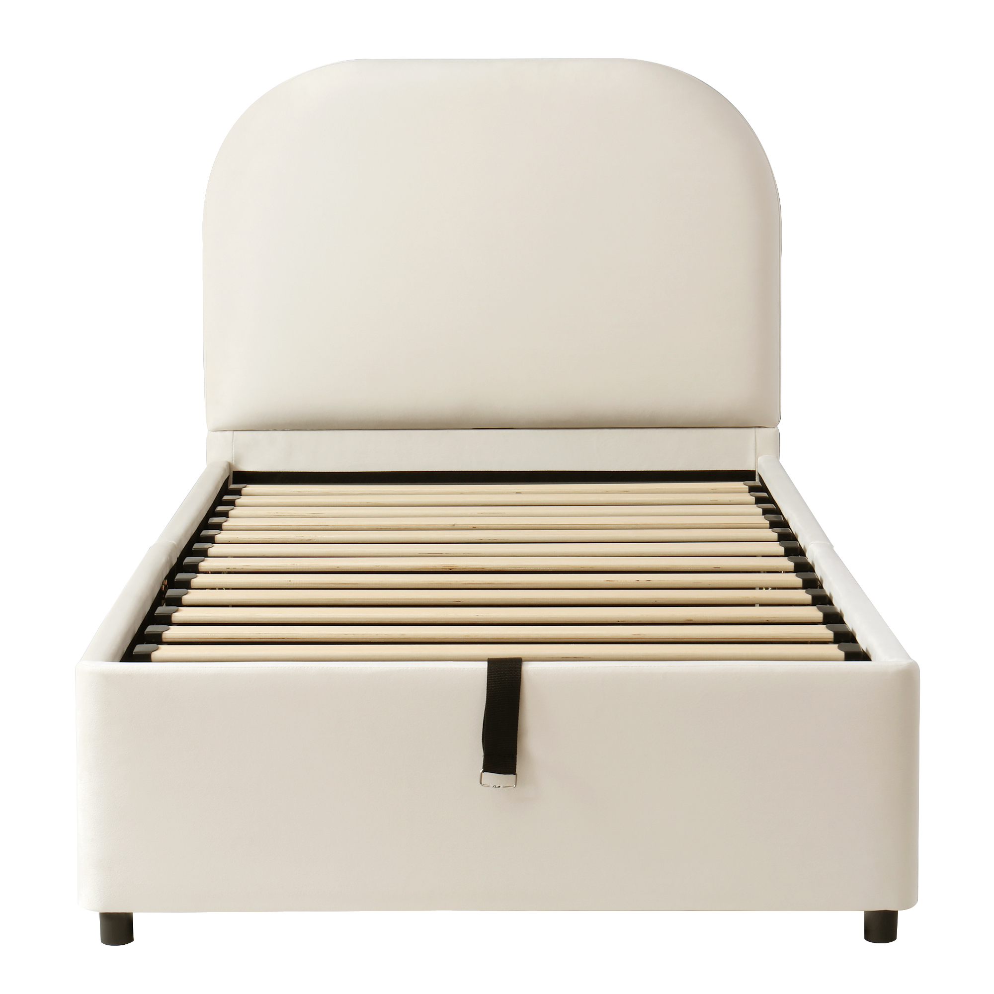 Verhoiltu sänky 90 x 200 cm, yhden hengen sänky sälepohjalla ja sängynpäädyllä, lastensänky säilytystilalla, sametti, beige