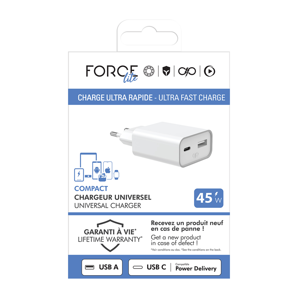 Tämä Force Liten valkoinen 45W:n GaN-laturi, jossa on kaksi USB-A- ja USB-C-porttia, tarjoaa erittäin nopean latauksen Power Delivery -palvelun sekä PPS-, QC4.0- ja Apple 2.4A -protokollien ansiosta. Kompakti, kevyt ja kierrätysmuovista ekologisesti suunniteltu laite voi ladata kahta laitetta samanaikaisesti ja takaa samalla turvallisuuden, suorituskyvyn ja yleisen yhteensopivuuden. GaN-teknologia takaa korkean hyötysuhteen pienessä paketissa.