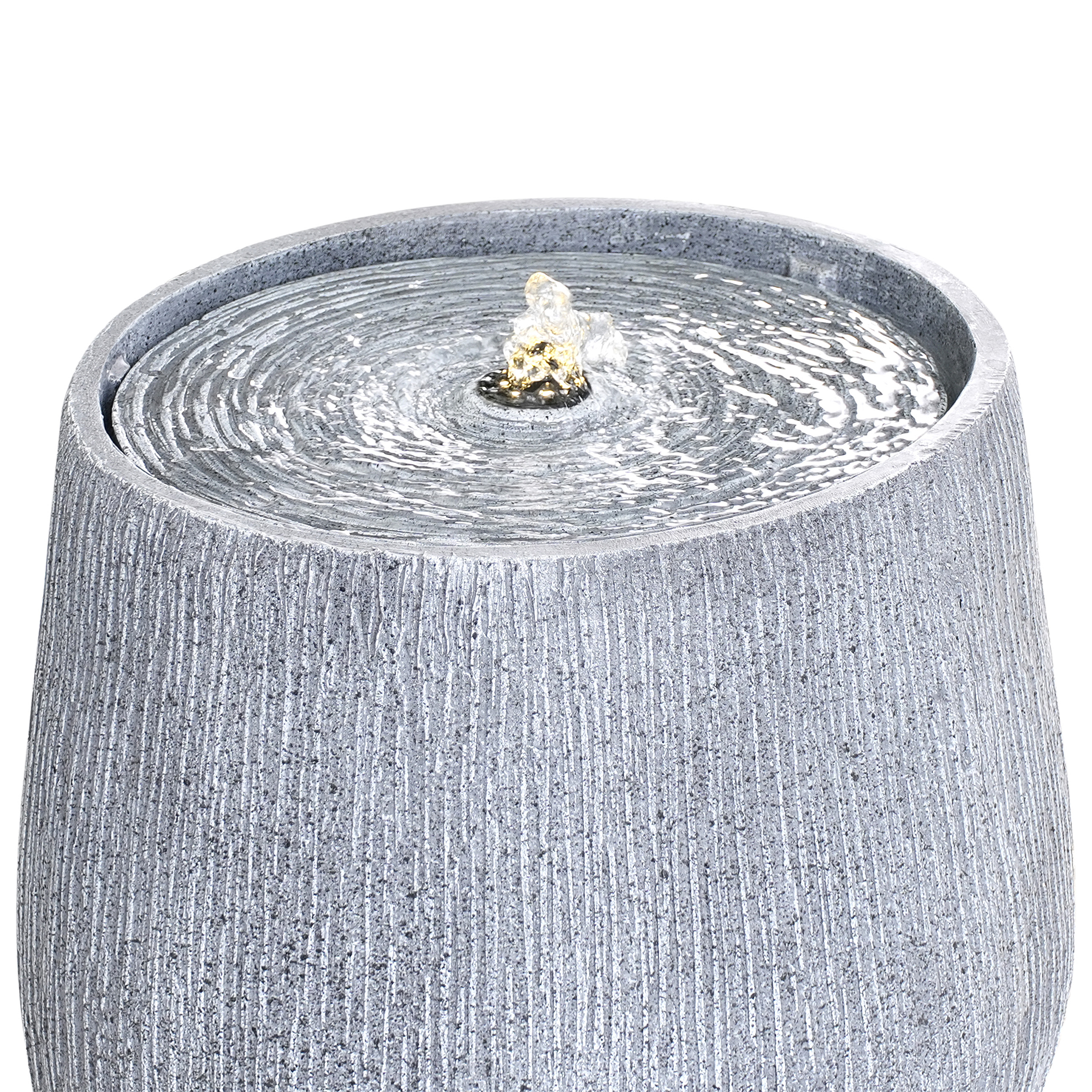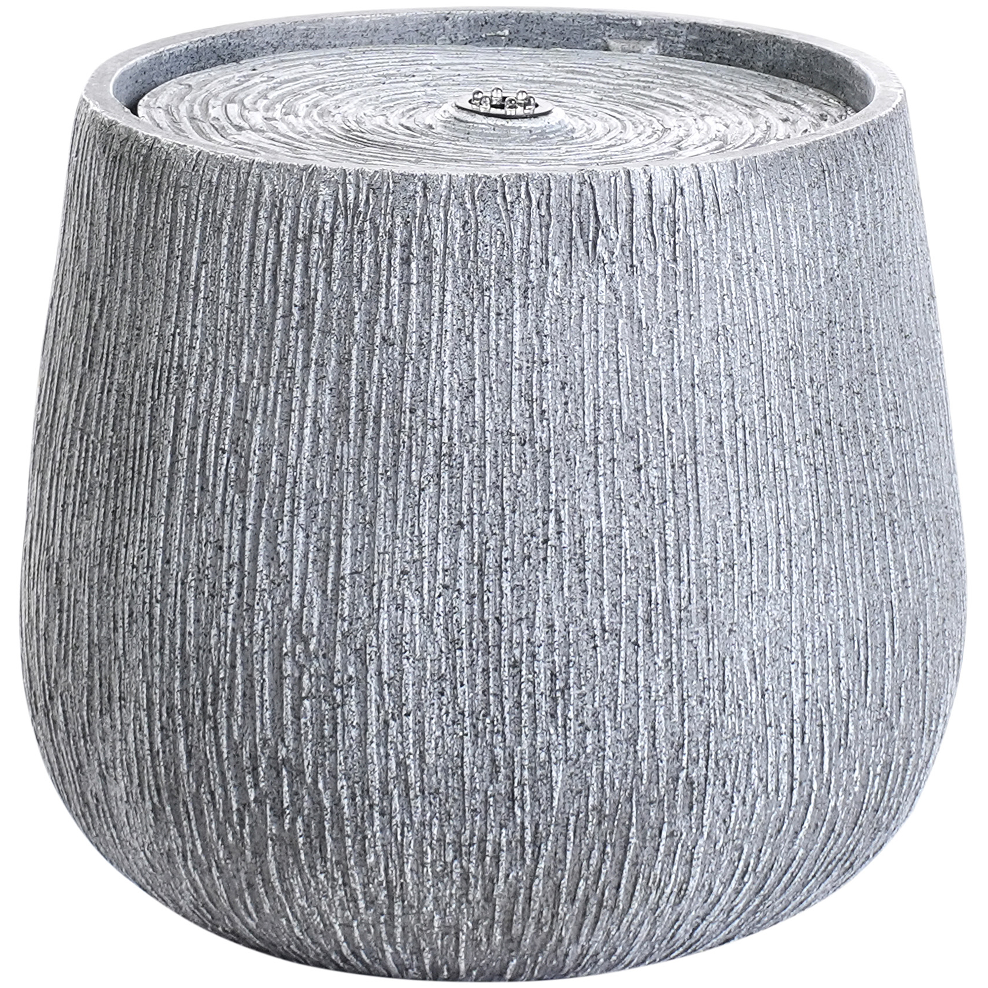 Moderni puutarhan vesielementti LED-valolla. Tämä tyylikäs ja hienostunut moderni vesiaihe on valmistettu kestävästä hartsista, jonka neutraali sävy sulautuu monenlaisiin ulkotiloihin. Siinä on uurrettu pinta ja minimalistinen siluetti, ja pehmeä sekä lämmin LED-valo täydentää hienovaraisesti lempeästi pulppuavaa vettä. Vesiaihe sopii täydellisesti nykyaikaisiin puutarhoihin, lisäten niihin rauhoittavaa ilmapiiriä puhtaalla ja elegantilla ulkonäöllään.