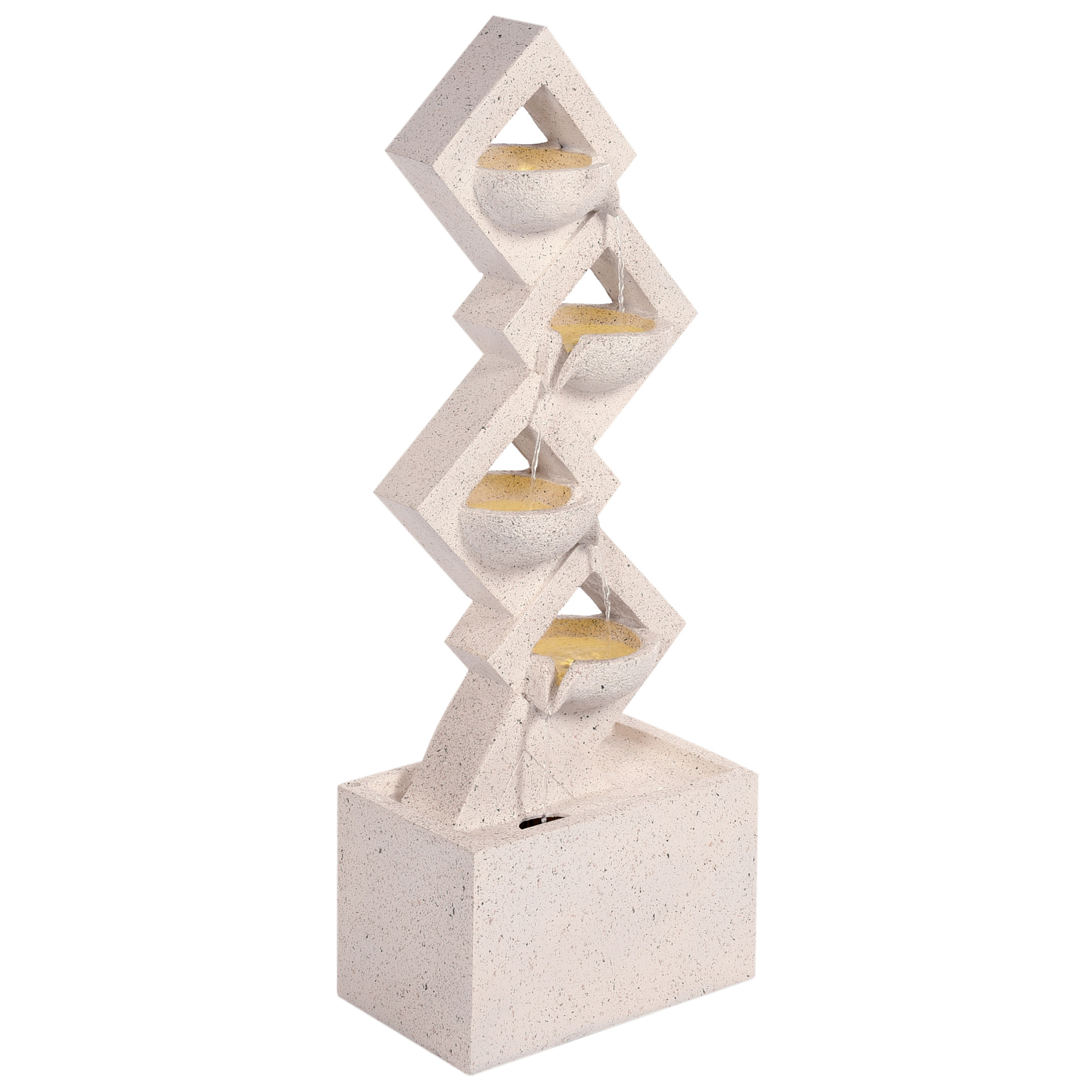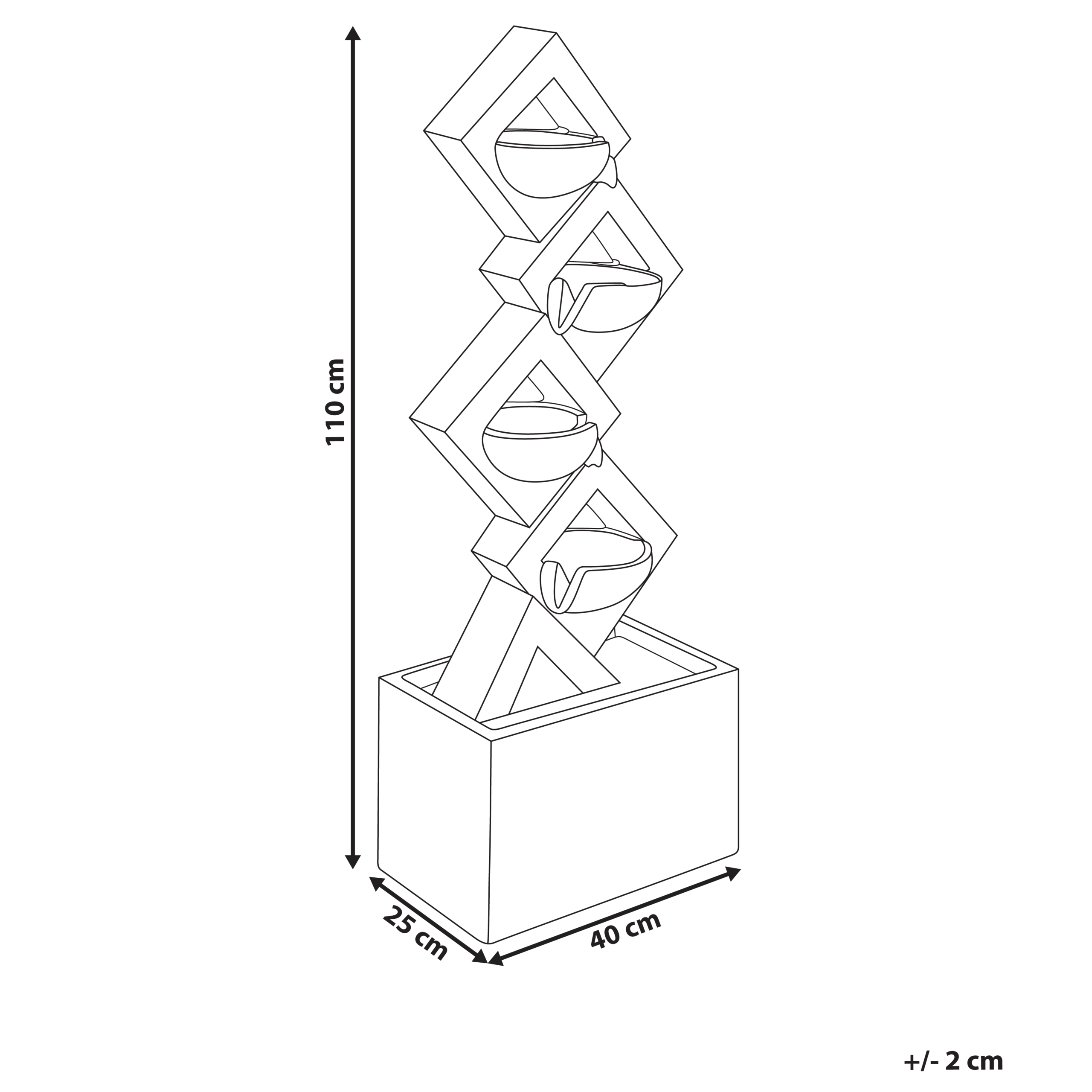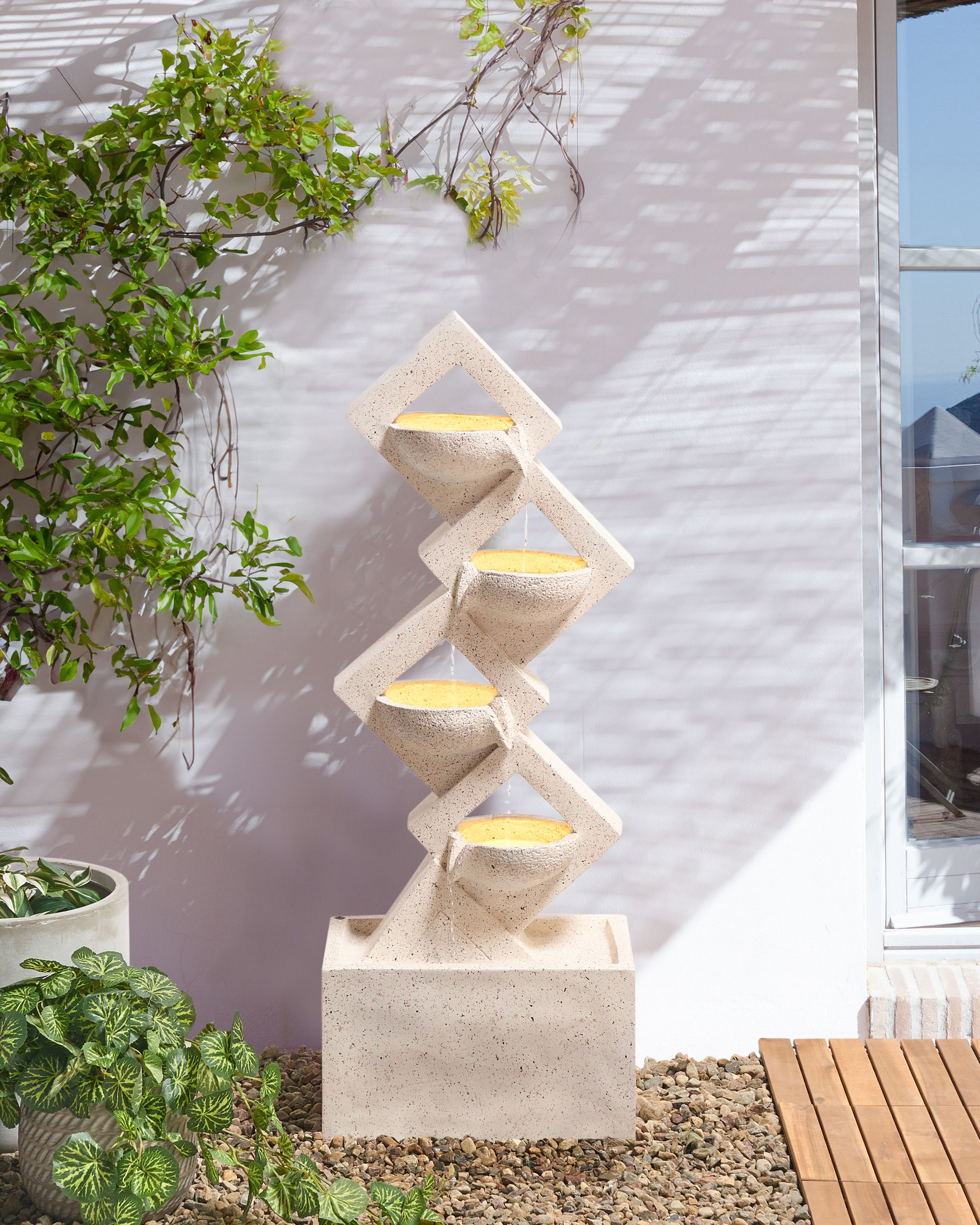Moderni puutarhan vesielementti LED-valoilla. Lisää puutarhaasi ripaus eleganssia tällä modernilla kerrostetulla vesiaiheella. Kestävästä ja UV-kestävästä hartsista valmistettu vesielementti kestää sääolosuhteita ja luo rauhoittavan tunnelman. Vesikulhoissa olevat integroidut LED-valot kaunistavat veden seesteistä virtausta, mikä tekee siitä upean keskipisteen sekä päivisin että öisin. Vesiaihe sopii erinomaisesti terasseille, parvekkeille ja puutarhoihin, tuoden niihin rentoa ilmettä ja tyyliä.